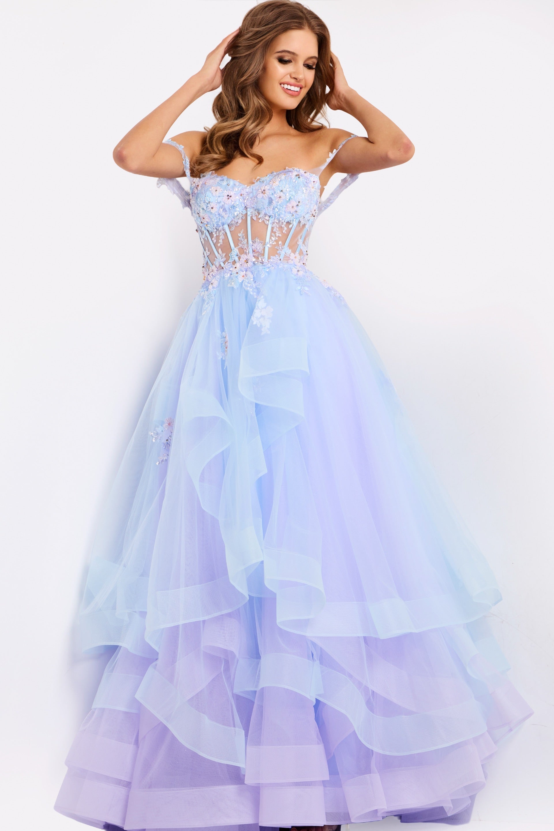 Step into a regal moment as this Jovani 47427 gown transforms your look with princess-like poise. Off-shoulder sleeves and sweetheart neckline lend balance to the fitted bodice, complemented by floral appliques that enhance its romantic appeal. The tiered tulle ballgown skirt falls in gentle waves, creating motion that feels both soft and striking. Each detail enhances the gown luminous presence from every angle. Bring your vision of perfect evening wear to life with Jovani 47427, a design that captures elegance through motion and detail. Model is wearing Lilac color.