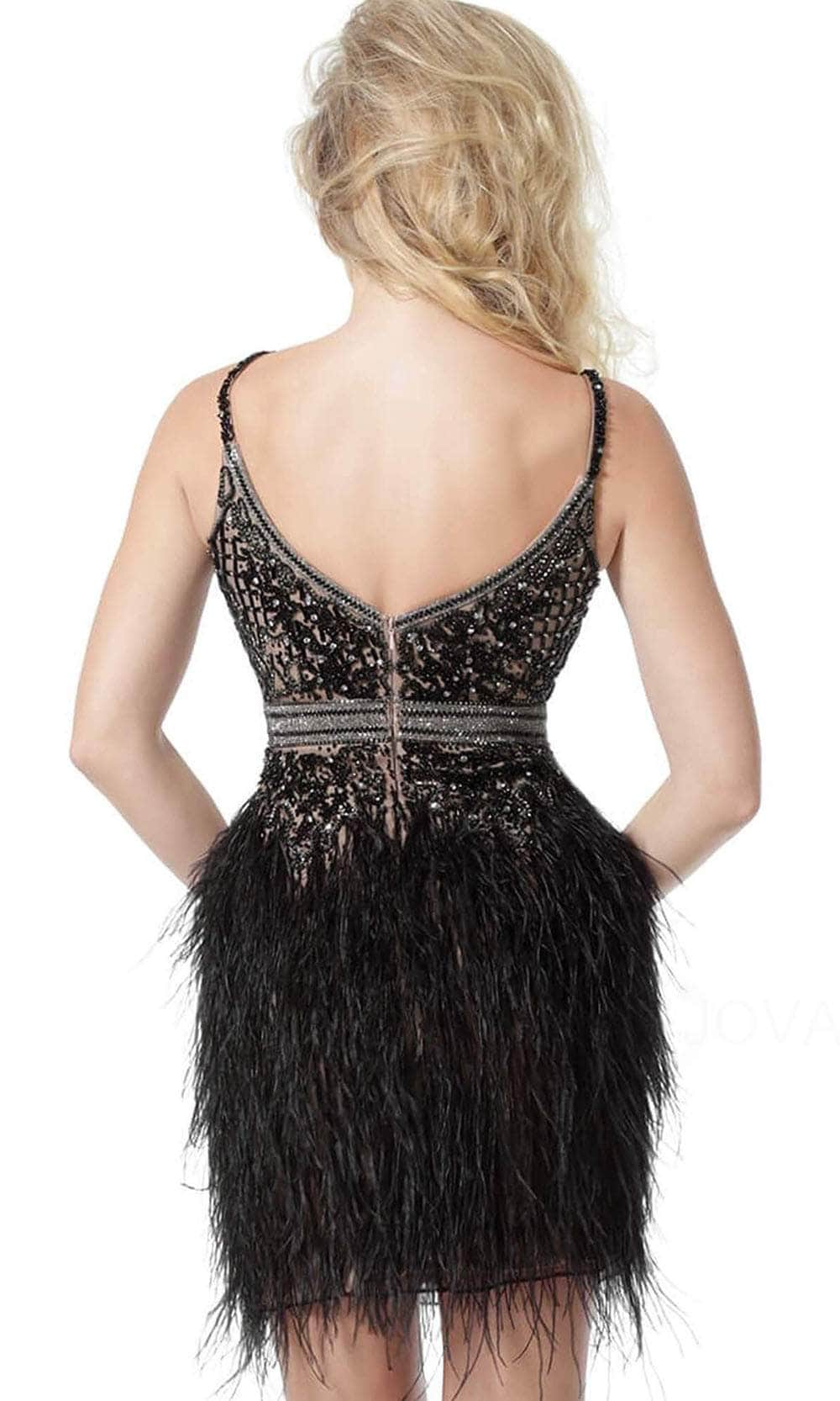 Stun and captivate with this exquisite Jovani 64266SC cocktail dress and surely draw envious gazes and leave an indelible impression. Strikingly decorated with intricate beadworks, the dress showcases a sleeveless, plunging V-neckline with sheer inset detail at the bust, spaghetti straps, and a sexy mid-open scoop back. A beaded waistband defines your hourglass figure. Revealing a faux-feather detail, the skirt flaunts a sheath silhouette that runs in short-length hem. Be the star of the show wearing this magnificent Jovani 64266SC masterpiece. Model is wearing the Black color.