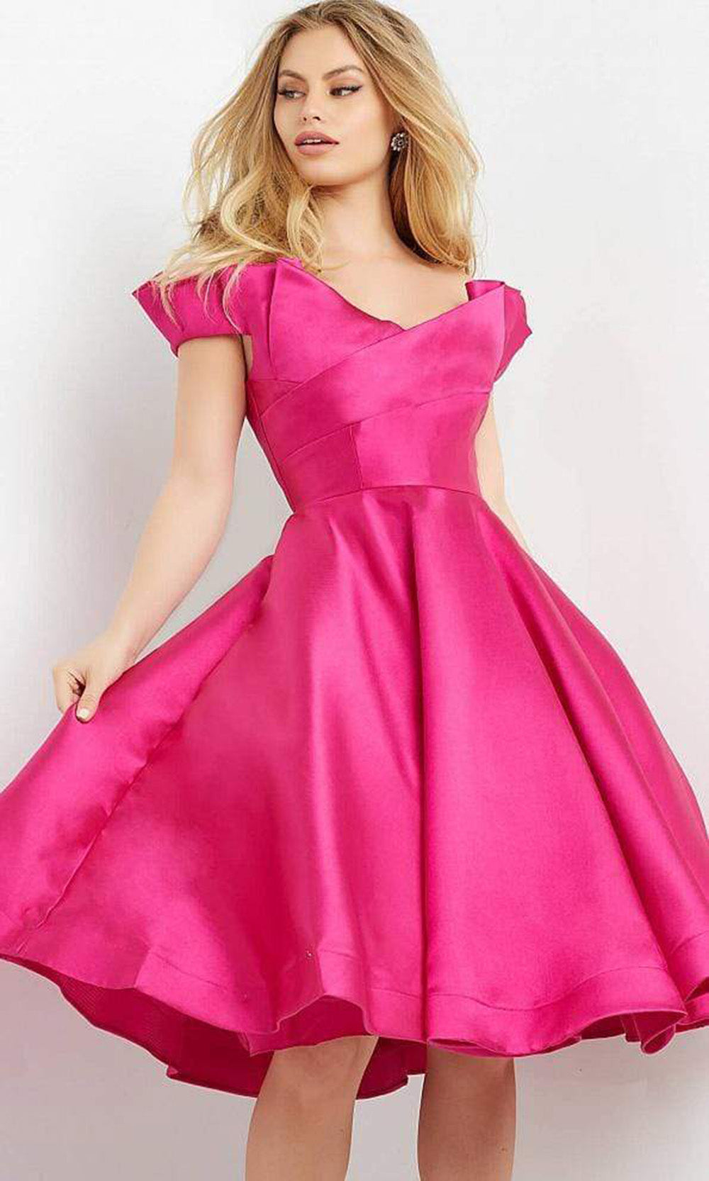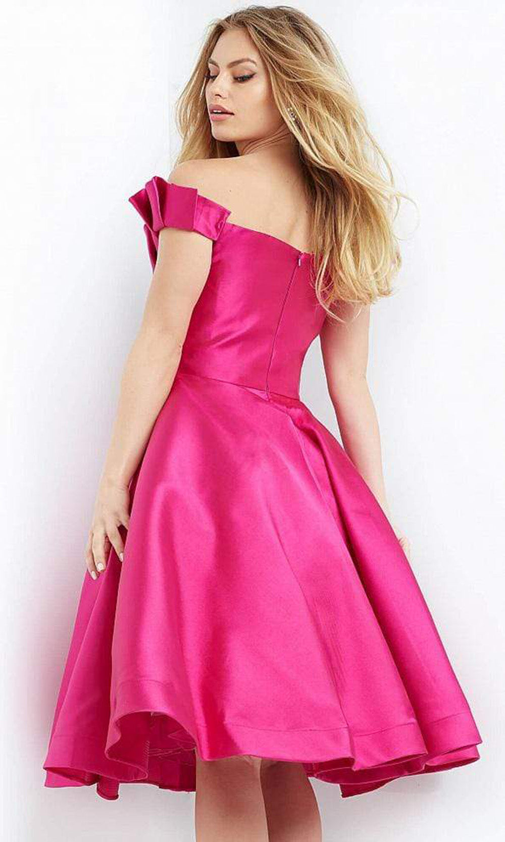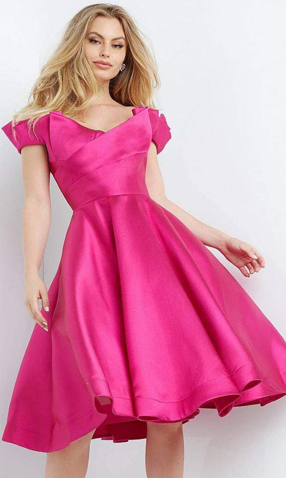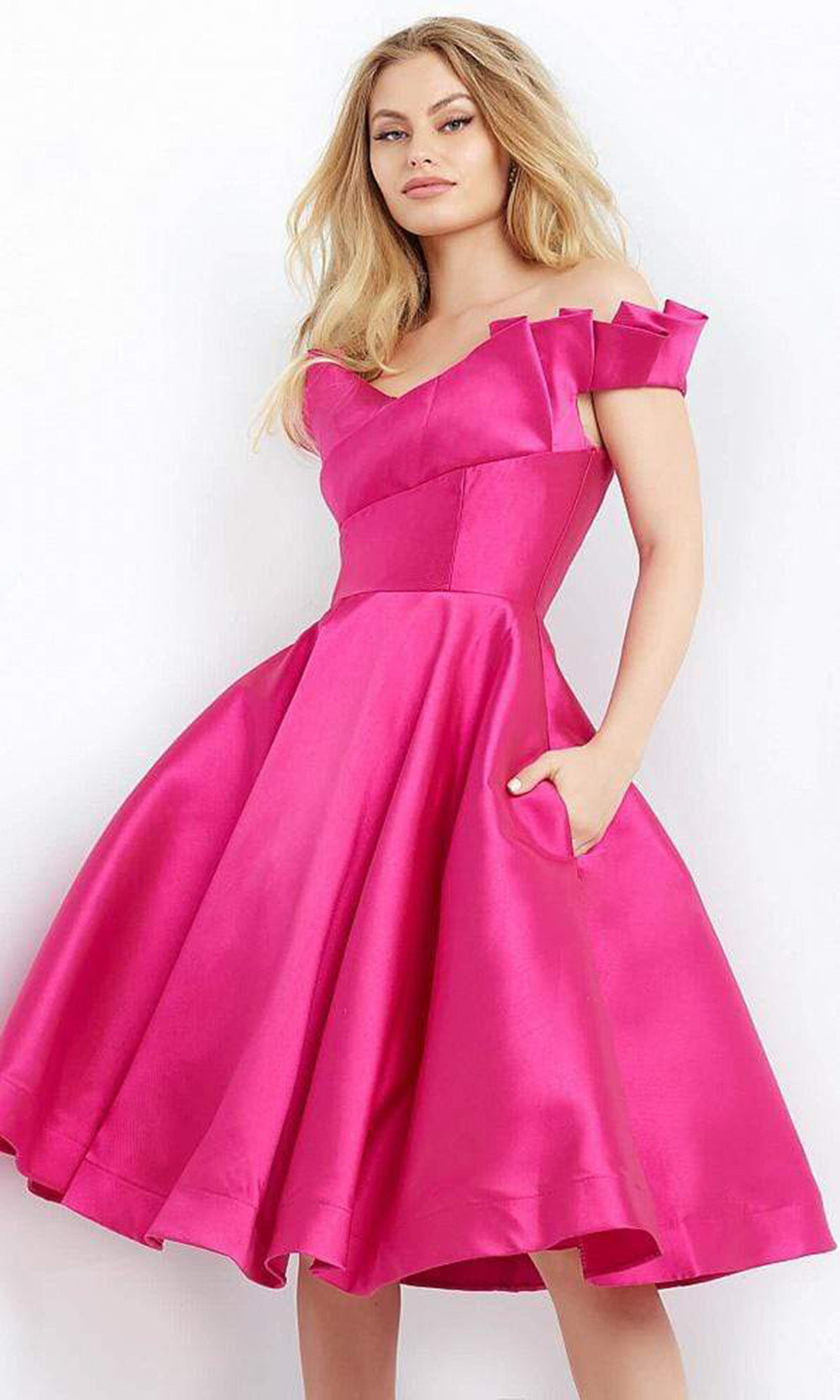 Show off your sassy and sophisticated sense of style with this JVN04718SC cocktail dress. Vibrant in silk Mikado fabric, this pretty party piece allures with ruffled off-shoulder neckline, brandishing a fit and flare silhouette with circular skirt with horsehair treatment at the hem. The dress is secured at the back with hidden back zipper and flourishes a knee length finish. Have a blast with this Jovani ensemble. Model represents the dress in Fuchsia color.