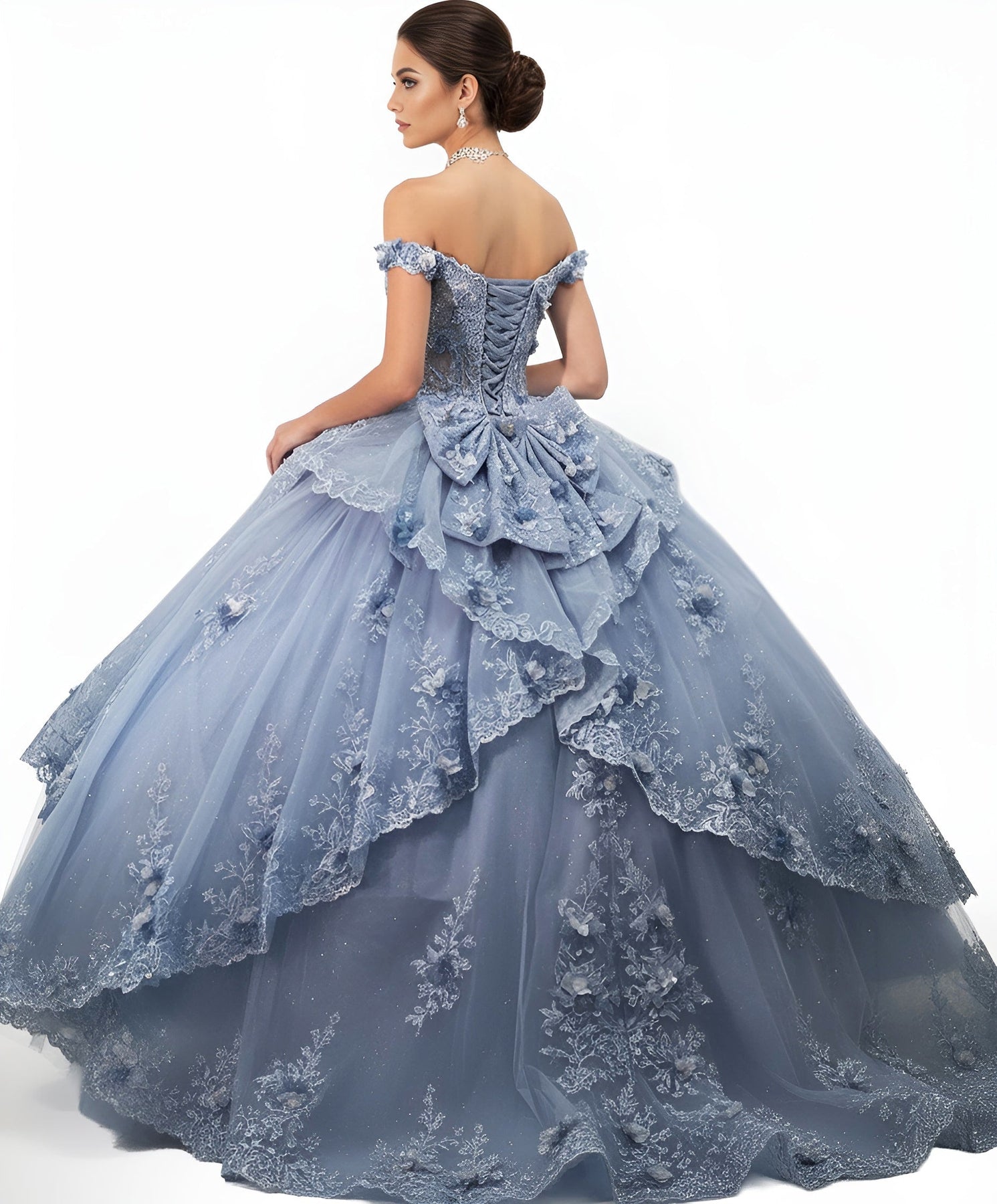 Details: 3D Floral Appliques, Embroidery, Sheer Bodice, Corset Structure, Voluminous Layered Skirt, Bow Accent