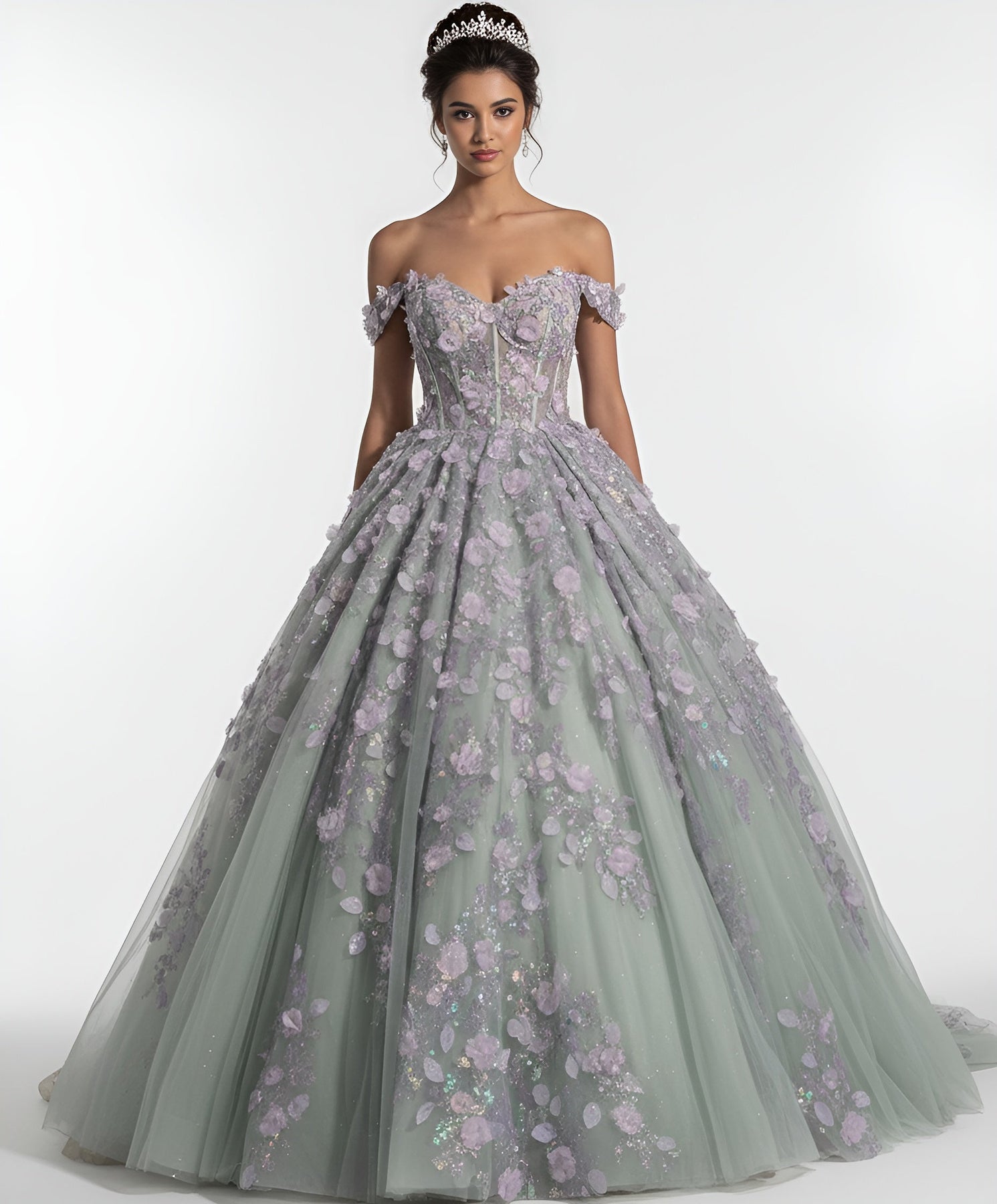 Ethereal and opulent, the Jovani Q46665 gown presents a vision of romance and grace. 3D floral appliques embellish the off shoulder sleeves and sweetheart neckline, leading into a structured corset bodice that offers refined shaping. The voluminous ballgown skirt is adorned with shimmering embroidery that elevate its charm and movement. Enhanced by a lace-up detail and a sweeping train that exudes sophistication. Ideal for making an unforgettable entrance, the Jovani Q46665 combines intricacy and drama into a single spectacular design. Model is wearing Sage color.