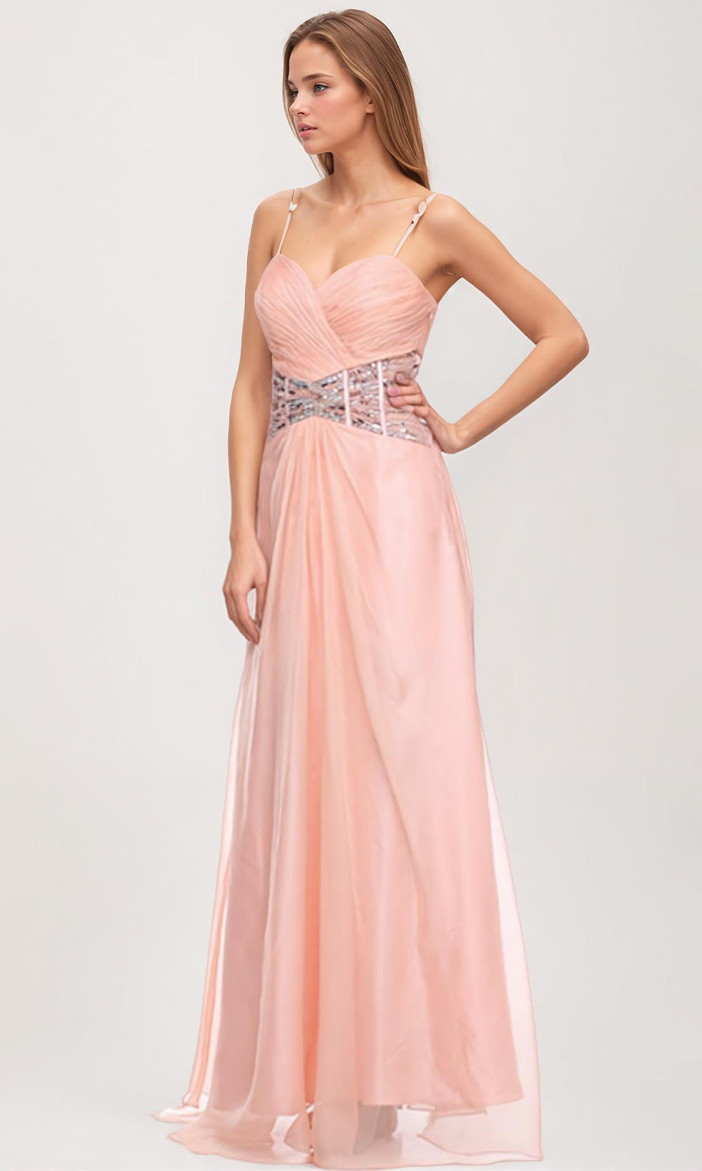 | Details: | Ruched Bodice, Beaded Waistline, Spaghetti Straps, Full-Length Hem |