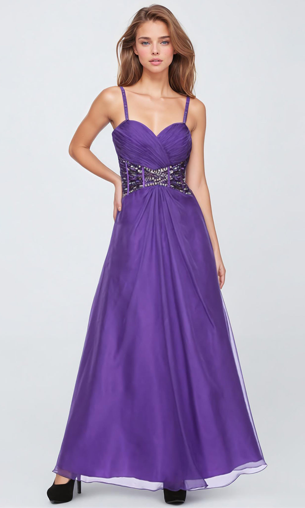 Confidence radiates through the presence of Juliet Dresses 550. This gown showcases a sweetheart neckline and ruched bodice supported by slim spaghetti straps, complemented by a sparkling beaded waistline that draws the eye. Its empire waist flows into a long A-line skirt, creating balance and movement. The overall composition is graceful while remaining versatile for formal settings. Juliet Dresses 550 is an invitation to embrace poise and distinction at any special occasion. Models are wearing Jade, Peach, and Purple colors.