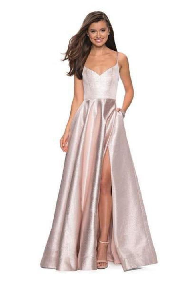 Reveal a style that would rival that of the celebrities in this La Femme 27619 creation. Fascinatingly crafted with tailoring lines along a metallic fabric, this exceptional piece shows a curving v-neckline supported with spaghetti straps. Converging into a deep v-open back, the A-line skirt parts with a sexy high slit before cascading down into a full-length hemline. Create interest among the fascinated crowd with your glorious La Femme masterpiece.