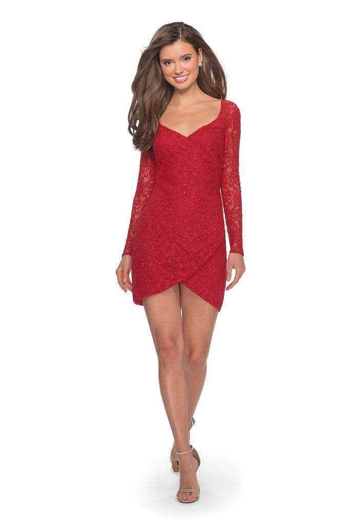 Brave the evening with temptress beauty and grace wearing La Femme 28232 creation. Rhinestones accent the lace fabric of this breathtaking cocktail dress that flaunts a faux wrap bodice crowned with a scoop neckline and framed with long sleeves, while the end of the sheath skirt shows a tulip style. The back is secured with a zipper closure. This La Femme 28232 creation is perfect for a standout style and flawless fit. Models are wearing Black, Cloud Blue, Electric Blue, and Pale Yellow colors.