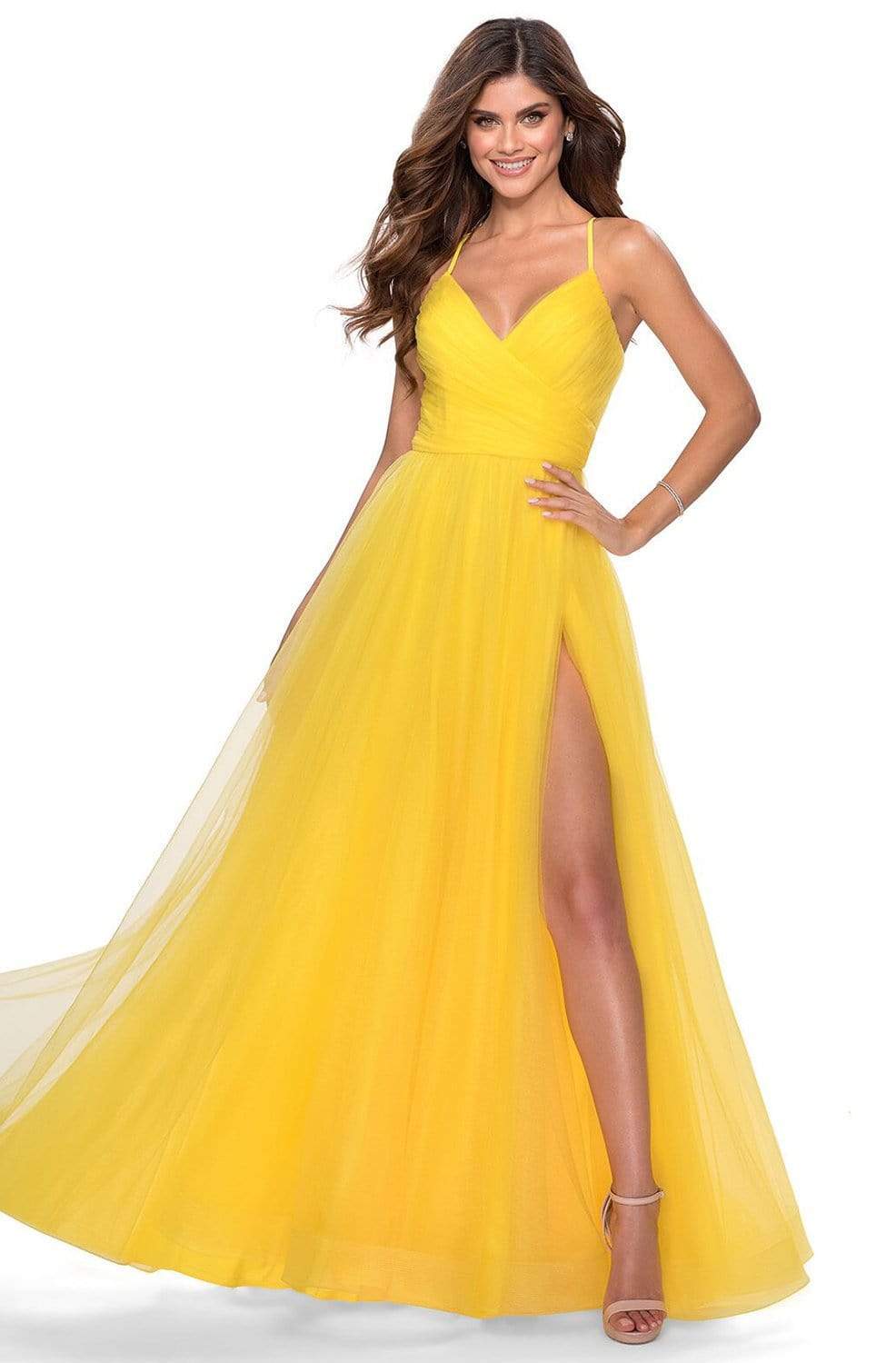 La Femme - 28561 Ruched Tulle A-Line Dress with Slit Evening Dresses 00 / Yellow