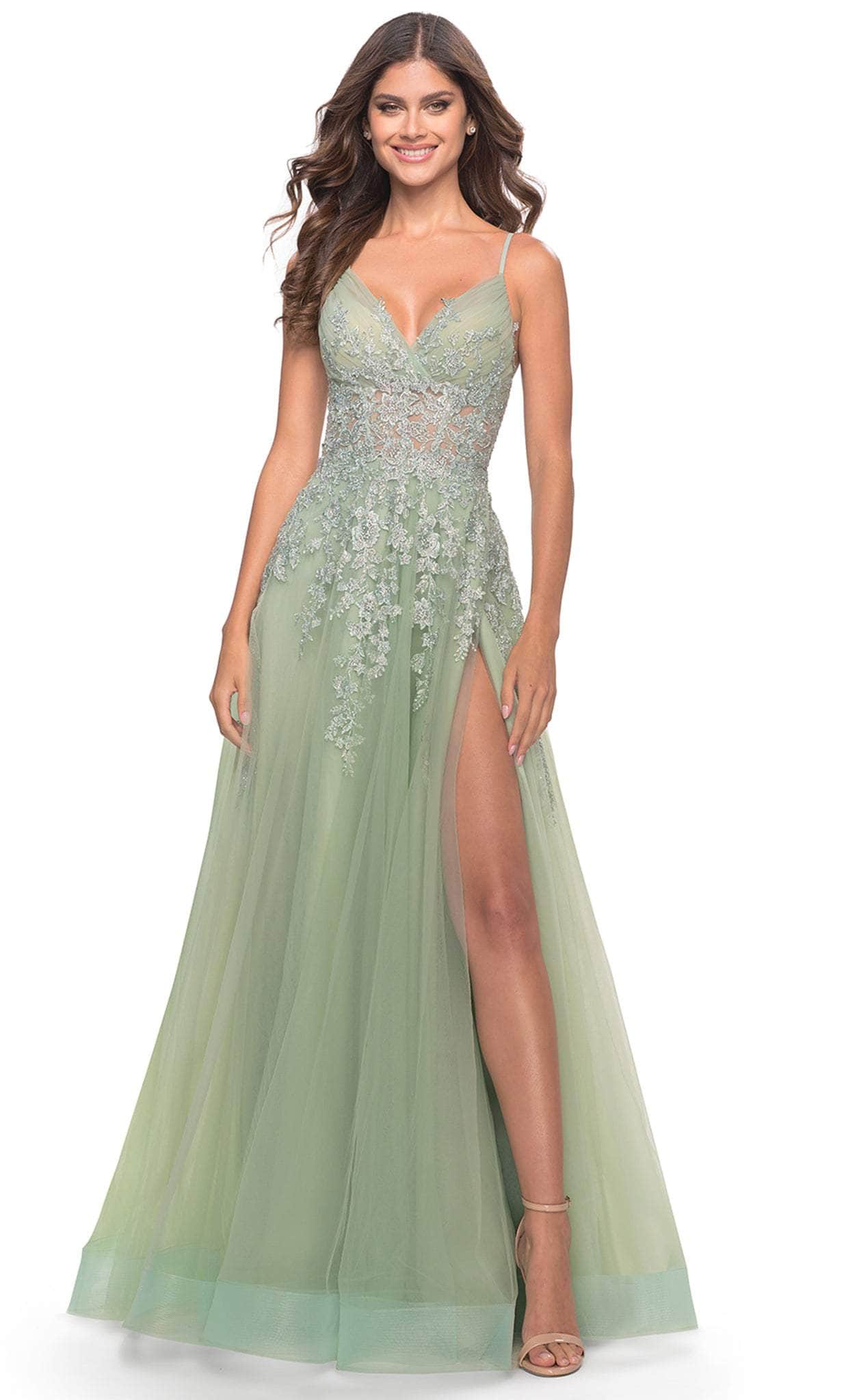 Look fantastic for your next formal event in this evening gown by La Femme 31393. This lace dress has lovely floral appliques and a fitted bodice with spaghetti straps and sleeveless. An open lace up is shown on the back for a flexible and cozy fit. The skirt has a side slit and an A-Line silhouette. This La Femme 31393 is awesome for prom or for any special night event! Model is wearing the Sage color.