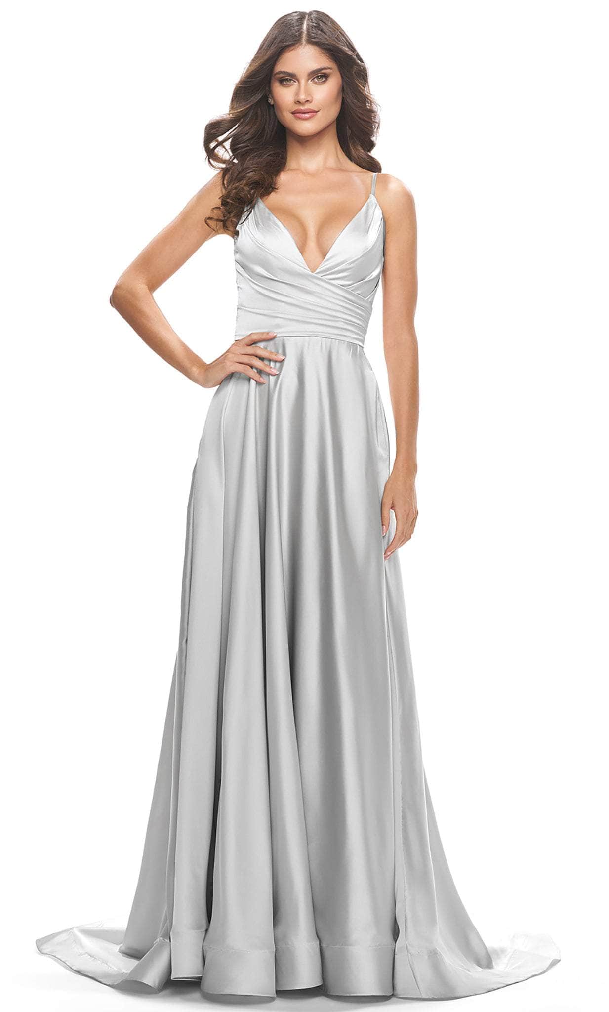 Fall head over heels with the romantic flair of this La Femme 31505 creation. Be glorified as a total stunner at your sumptuous event, this delight crafts a deep v-neckline and a faux wrap style bodice on a luxe satin silhouette. Rendered with spaghetti straps while revealing a deep v-styled open back, the skirt reveals a sexy thigh high slit as it drapes the floor with a sweeping denouement. Be everyone’s delight in this gorgeously Be everyone’s delight in this gorgeously styled La Femme masterpiece. Models are wearing the Lavender, Nude, Silver and Teal colors.
