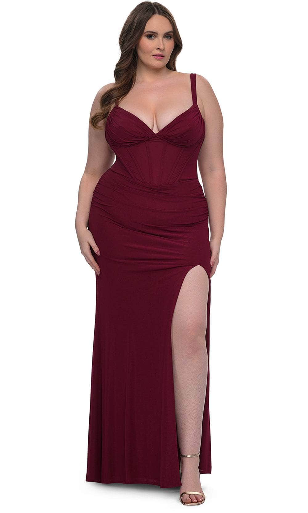 Capture attention with the La Femme 33015 dress, designed to highlight plus-size curves. This gown features an elegant sleeveless design with a corset-style bodice and exposed boning, blending modern flair with classic elegance. The fitted sheath silhouette and skirt slit add a dramatic touch, while the back zipper closure ensures a perfect fit. Ideal for formal events, the La Femme 33015 is a stunning addition to any wardrobe, exuding confidence and sophistication with every step.