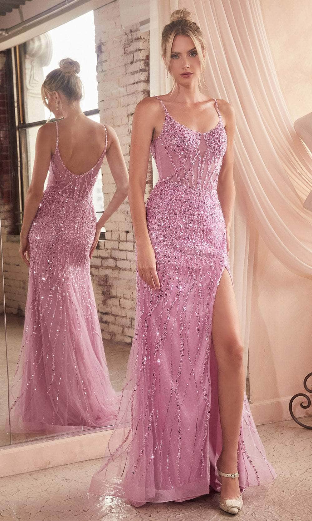 Look breathtaking and confident in this Ladivine CD0220 gown on your big night. This sleeveless ensemble decorated with lavish beadwork and sequin creates an incredibly eye-catching shine. The spaghetti straps provide comfortable support, while the alluring scoop neckline echoed by the scoop back, and an illusion corset bodice with visible boning are standout features. With a high slit that exposes a tantalizing portion of leg, the sheath skirt flows elegantly to the floor and ends with a horsehair hemline. Make it a moment to be a stay in this Ladivine CD0220 masterpiece. Models are wearing Black, Blossom Pink, Greenery, Orange, Orchid, Red, Rose Gold, Smoky Blue, Yellow, and Silver colors.