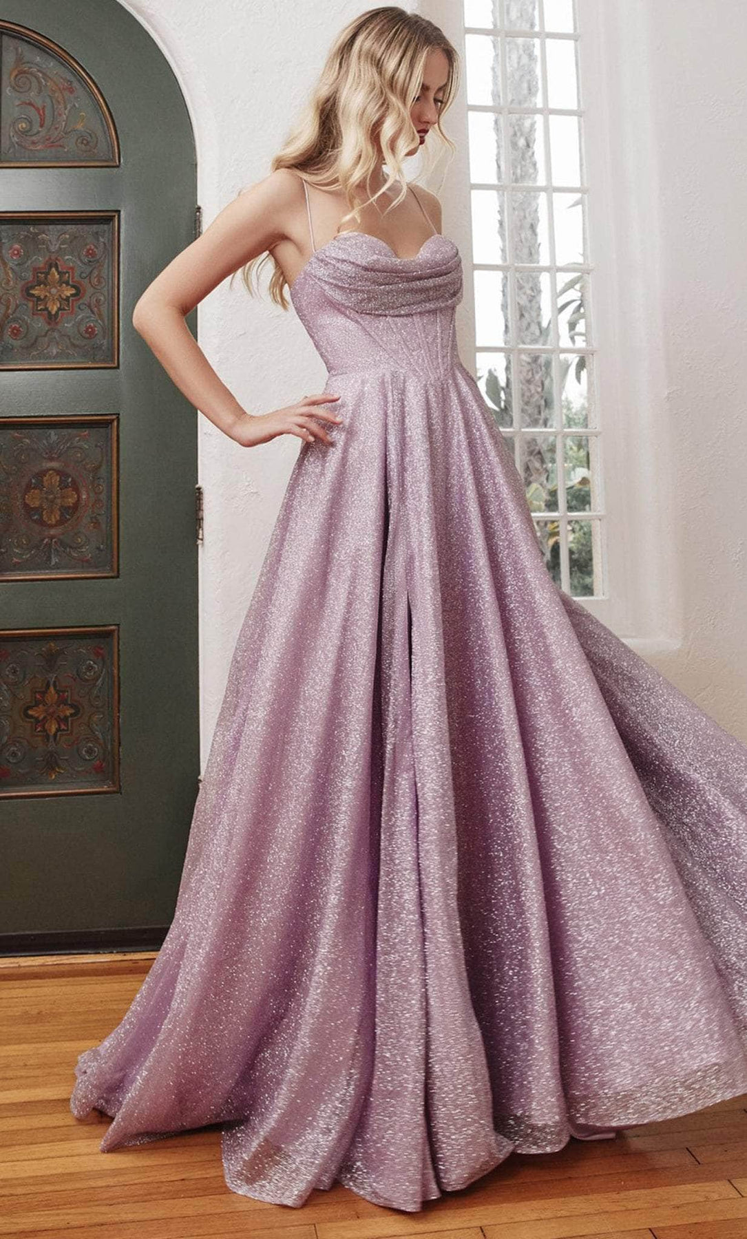 Glam up the evening in the Ladivine CD252C gown and exude refinement and elegance. This gorgeous outfit oozes sophisticated glamour. It features a corset boning bodice with a lovely cowl neckline that creates an alluring silhouette. This gown, which is sleeveless and has glitter adornment, exudes elegance and beauty with ease. Subtle spaghetti straps support the bodice and lead to an enticing lace-up tie closure at the back that gives the ensemble a hint of sex. From the natural waist, the skirt flares into a gorgeous A-line silhouette that grabs attention as it flows elegantly to a sweeping train. To finish the appearance, a daring high-leg slit lends a hint of intrigue. Take center stage and rule the evening in the stunning Ladivine CD252C dress, a work of art that guarantees all. Models are wearing the Champagne, Lavender, Red and Smoky Blue colors.