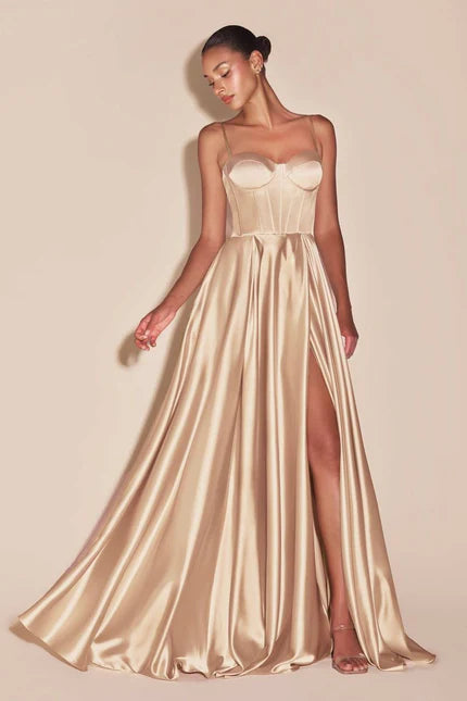 Details: Adjustable Spaghetti Straps, Corset Boning Bodice, Mid-Open Lace-Up Back, Pleated Skirt, High Slit, Sweep Train