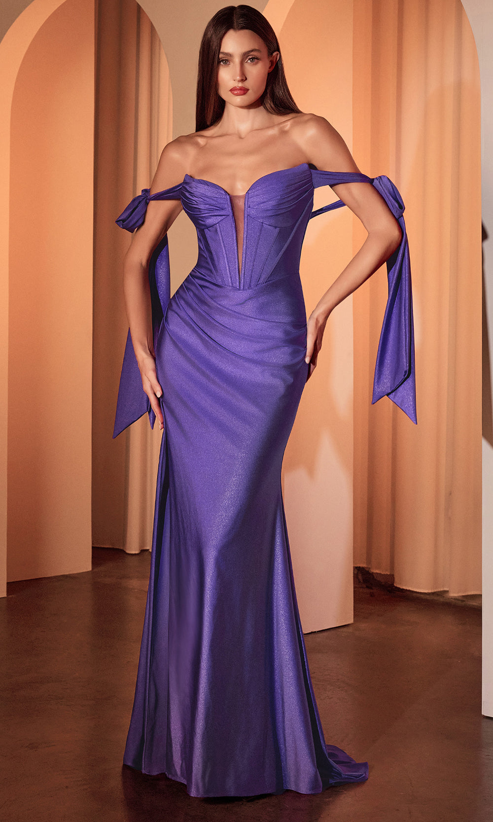 Showcase your stunning figure in the exquisite Ladivine KV1120 evening dress, a true statement piece that will leave everyone in awe of your beauty. This enchanting gown features an elegant off-shoulder V-neckline that enhances the fitted bodice, adorned with charming bow straps and structured boning for added support and sophistication. The back is designed with a mid-open cut, elegantly secured with lace to provide a graceful finish. The bodice is beautifully styled with pleat detailing, while the glittering sheath skirt flows with captivating draping effects and boasts an enticing high slit that elevates the overall allure of the dress. Step into the spotlight with confidence and let all eyes be drawn to you in this remarkable Ladivine KV1120 masterpiece, where glamour meets exquisite design. Models are wearing Black, Purple, Red, and Royal colors.
