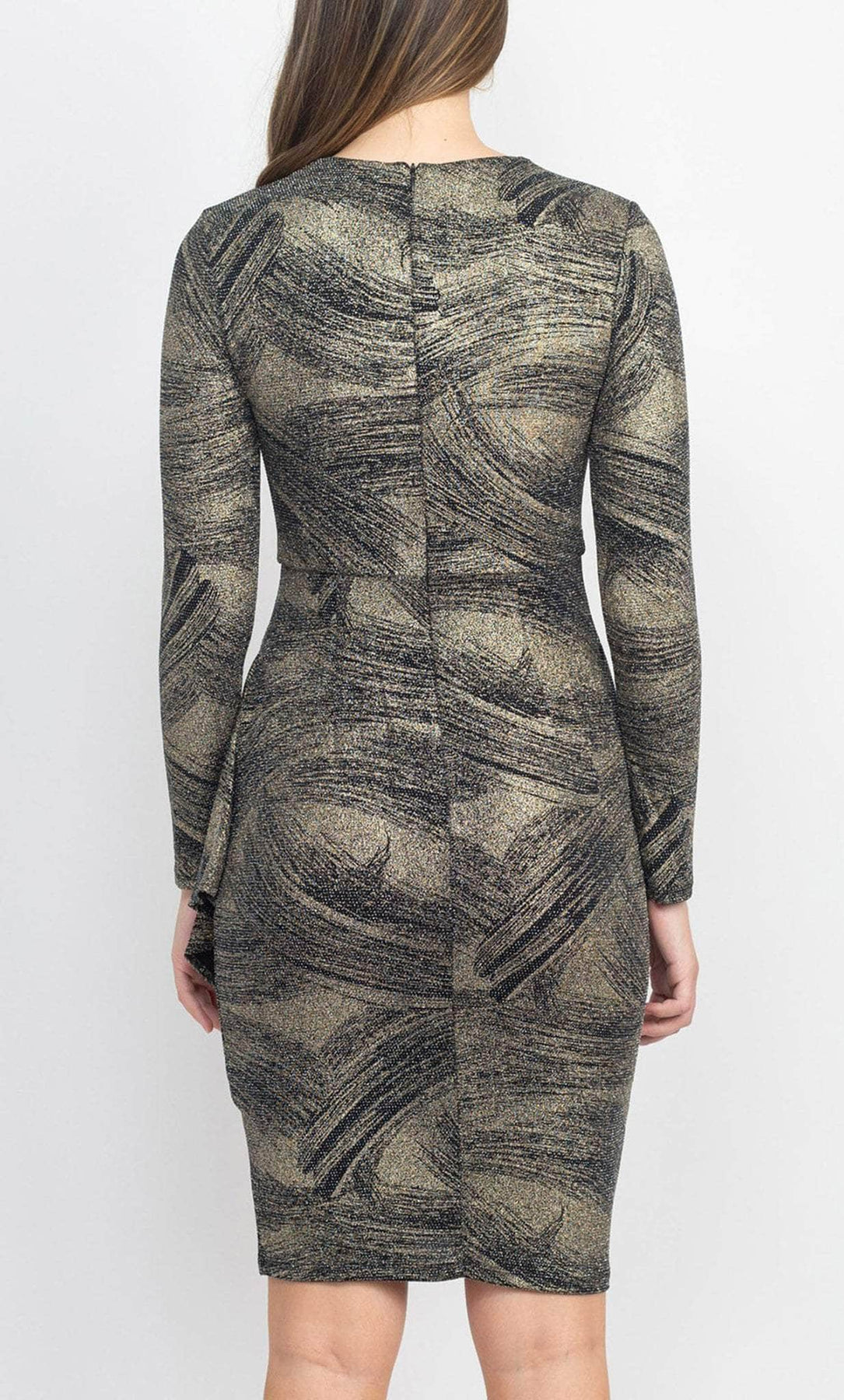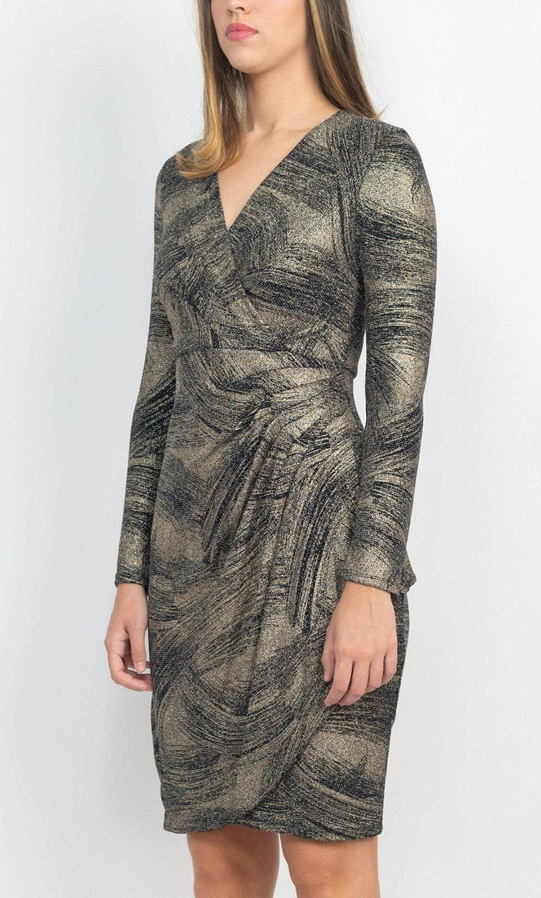 Surround yourself with sparkle of glamour when you walk in this dazzling Immediate Apparel T4716M. It shines and glitters because it is composed of cloth that already has shimmer sewn into it. Additionally, print design is simple. Shows a fake wrap style and a sheath silhouette with a knee-length finish. Has a V-neckline shape and long sleeves. Standout among the fabulous crowd as all eyes focus on you in this glamorous Immediate Apparel T4716M creation. Model is wearing Gold Black color.