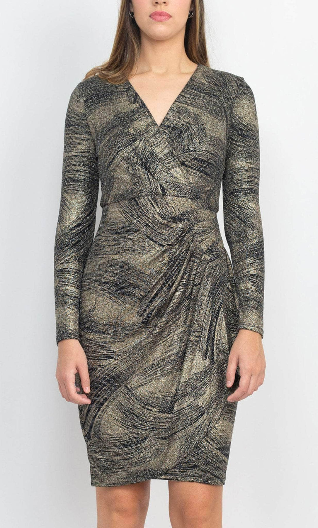 London Times T4716M - V Neck Faux Wrap Long Sleeve Dress