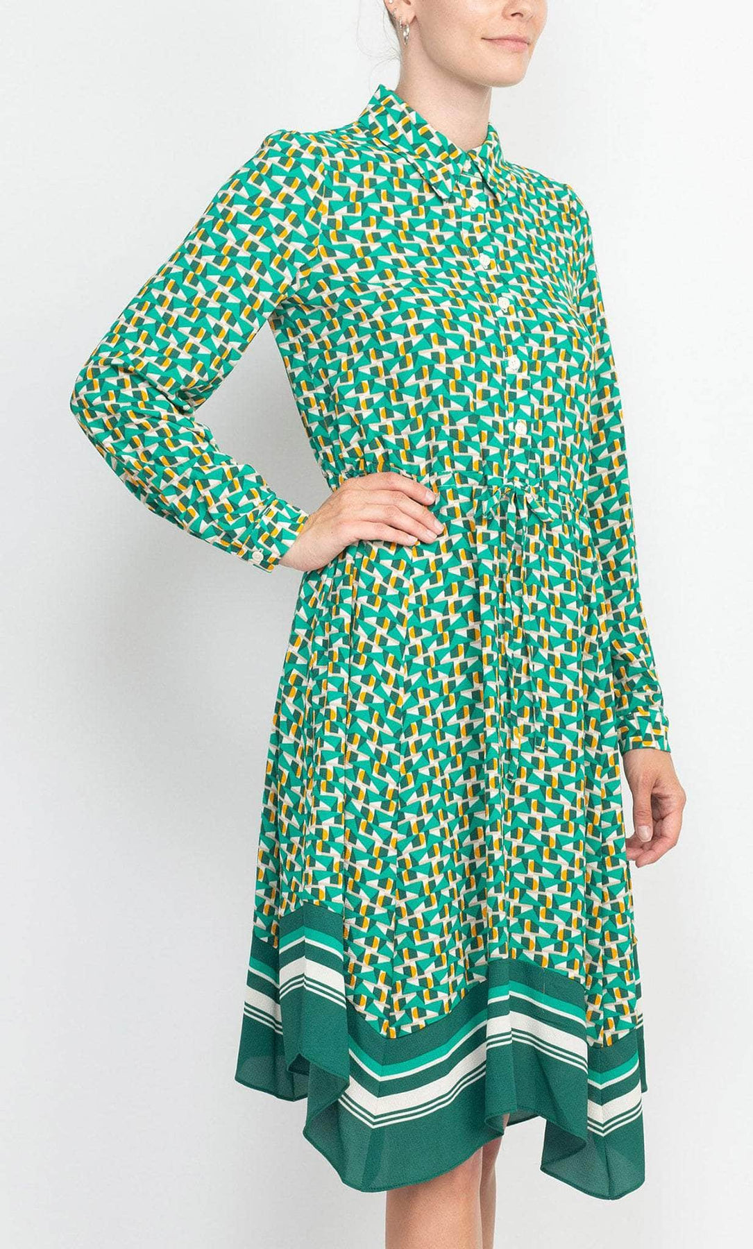 Capture that striking presence and get everyone's attention in this London Times T6031M. Look stunning at your event in this gorgeous dress which features a collared neckline and long sleeves with buttons at the cuffs. The knee-length A-line skirt has a drawstring and delicate pleating. This winning piece is closed with buttons on the front. This dress is sure to draw attention. You are a breath of fresh air in this fun and pretty dress from the London Times T6031M masterpiece. Model is wearing Green Gold color.