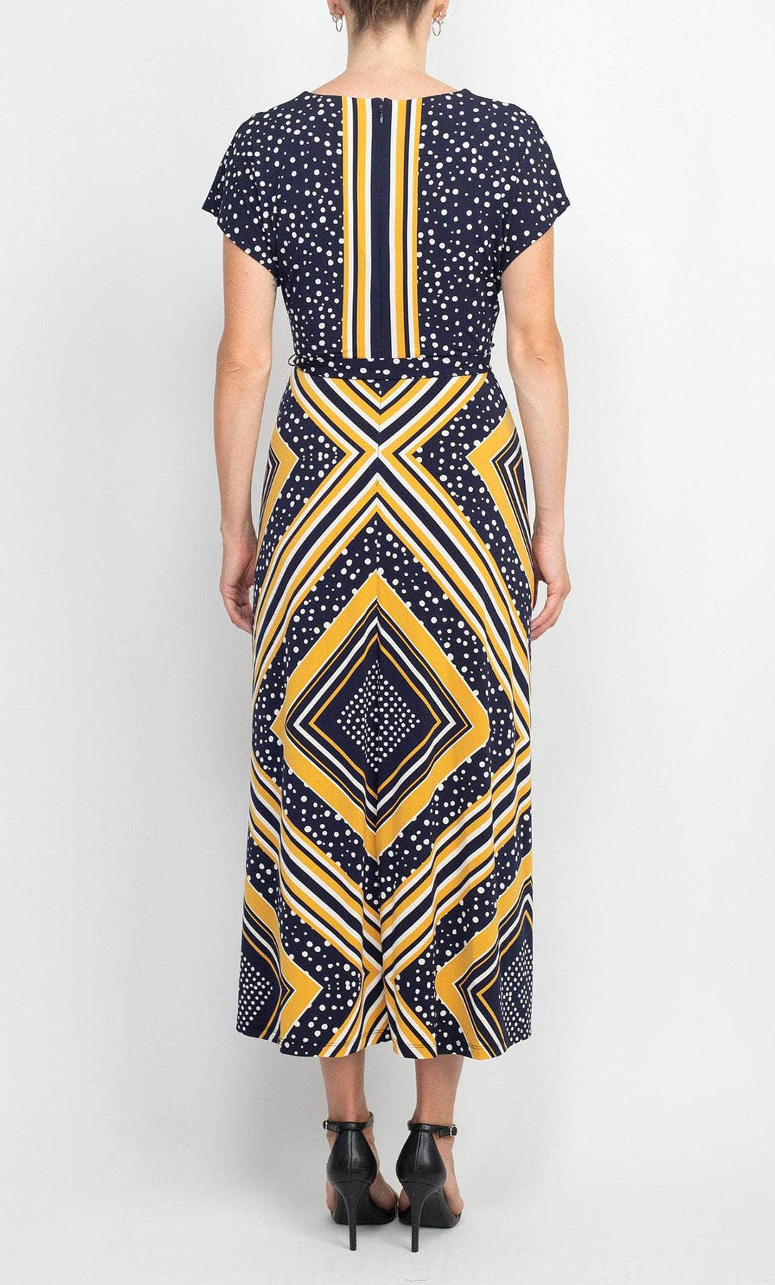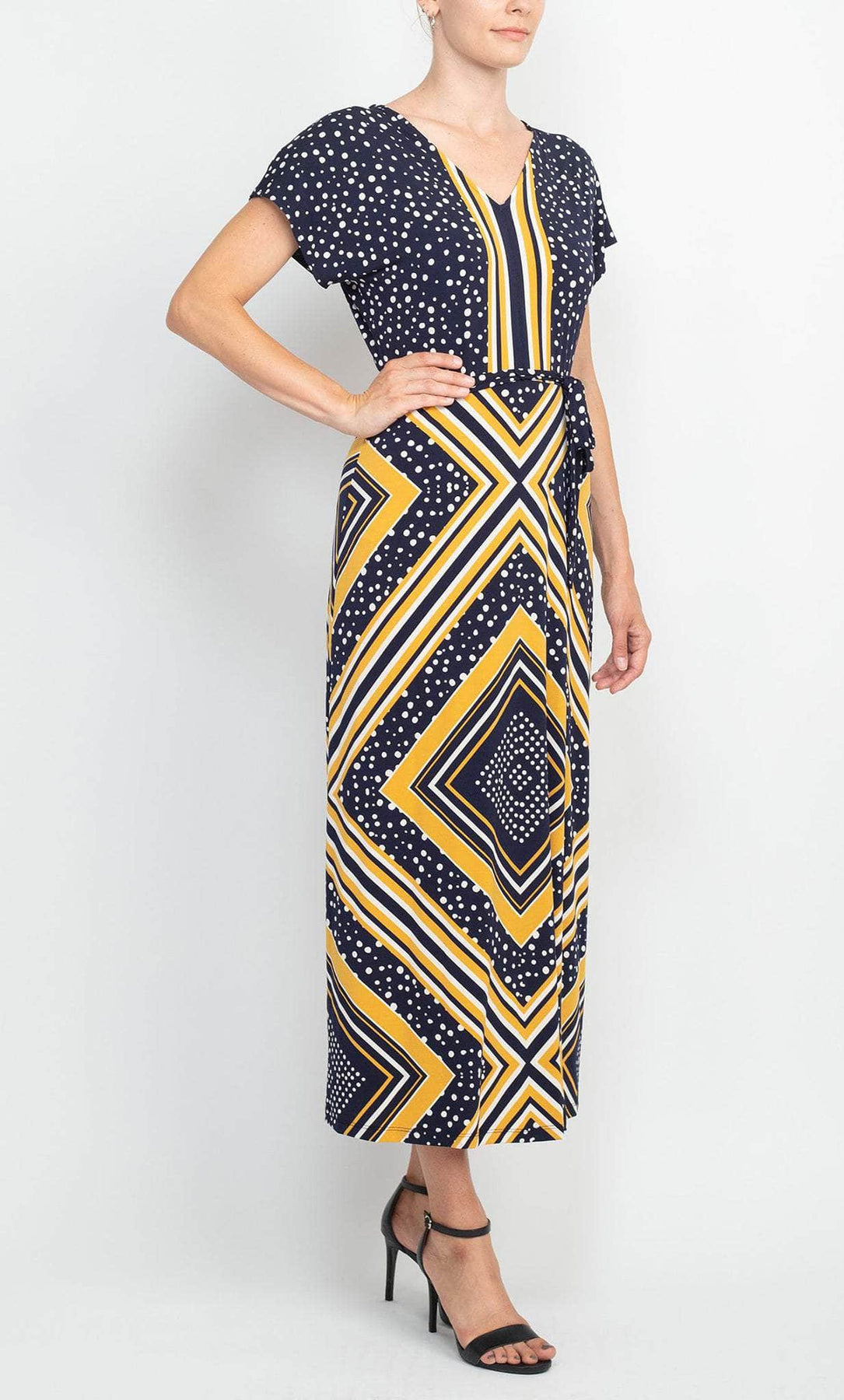 Look stunning at your event wearing this casual yet lovely London Times T6036M. Look simple yet elegant in this fabulous dress which features a V-neckline supported by flutter short sleeves in a geo dot print with the natural waist cinched by a tie. This dress has an A-line silhouette that cascades into a tea-length hemline and a full back with a back zipper closure. This London Times T6036M masterpiece elevates glamour. Model is wearing Yellow color.