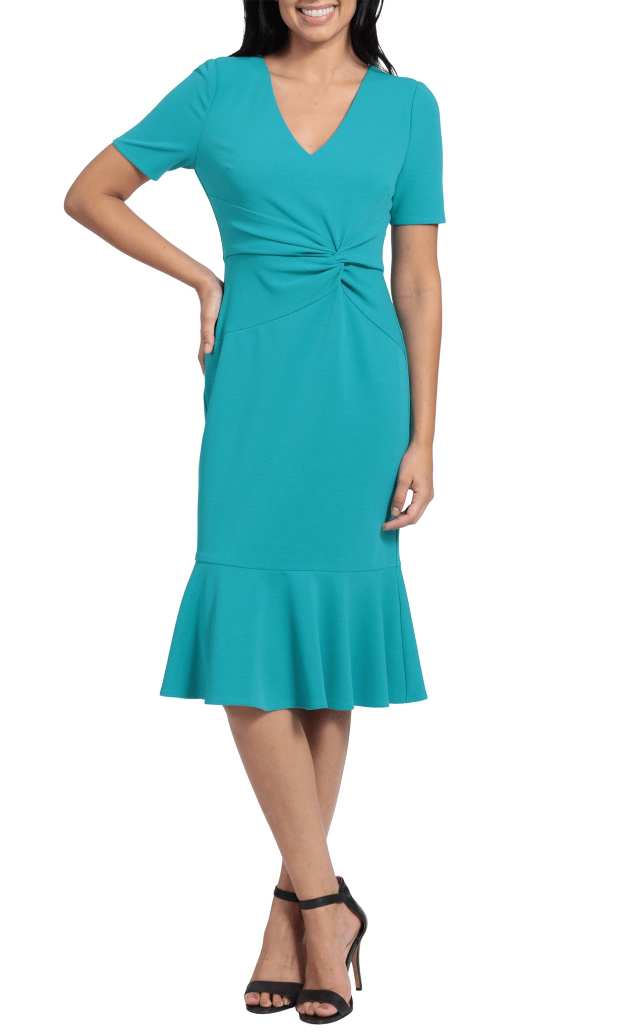You will be an enchanting beauty in London Times T6064M style. Exquisitely fashioned on a scuba crepe fabric, this simple dress presents a deep v-neckline, short sleeves and an alluring knotted ruched waist. The back is closed by the center zipper. Ending in a ruffled hem, the skirt sculpts a sheath silhouette in a tea length hem. This London Times T6064M dress is a classic look that works for many special occasions. Models are wearing the Baton Rouge, Black, Midnight Teal and Scarlet Red colors.