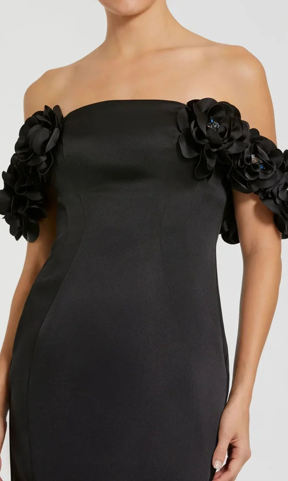 True evening style emerges in this Mac Duggal 11872 showstopping piece designed to capture attention effortlessly. The gown highlights the collarbone with an off shoulder neckline, complemented by 3D floral cap sleeves. Its smooth fitted bodice transitions into a sleek sheath skirt that extends to the floor, showcasing elegance in every step. Created for women who appreciate detail and balance, this gown is suited for the most memorable occasions. Wearing Mac Duggal 11872 is a celebration of refined taste and classic glamour. Model is wearing Black color.