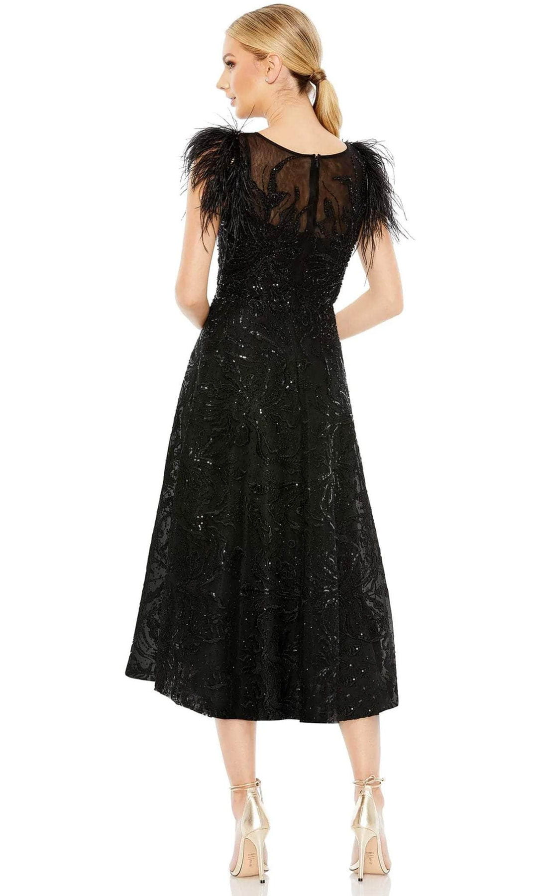 Get glamorous underneath the modern and classic detailing on the A-line silhouette of Mac Duggal 20400. For semi-formal to formal gatherings, a tea-length dress that flows into an A-line silhouette is ideal. Featuring a jewel neckline and feathers on the shoulder. Embroidery and tiny sequins are used to decorate the entire outfit. A zipper is used to conceal and fasten the enclosed back. Mac Duggal 20400 is perfect for a standout style and flawless fit. Model is wearing Black color.