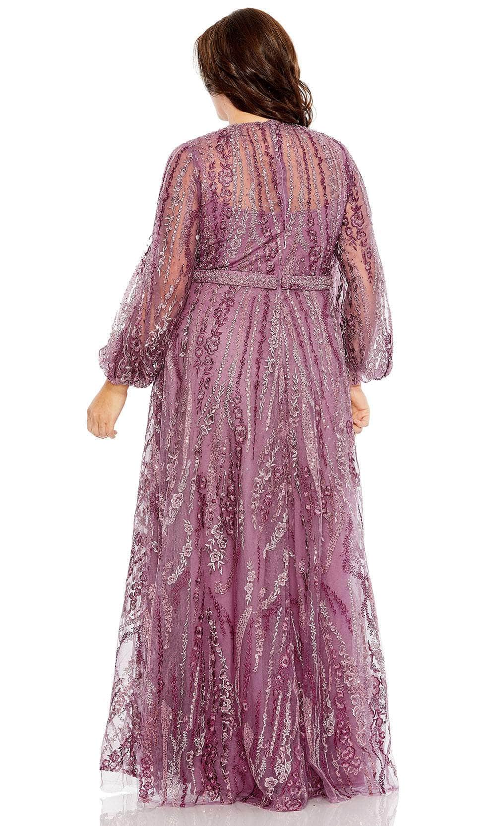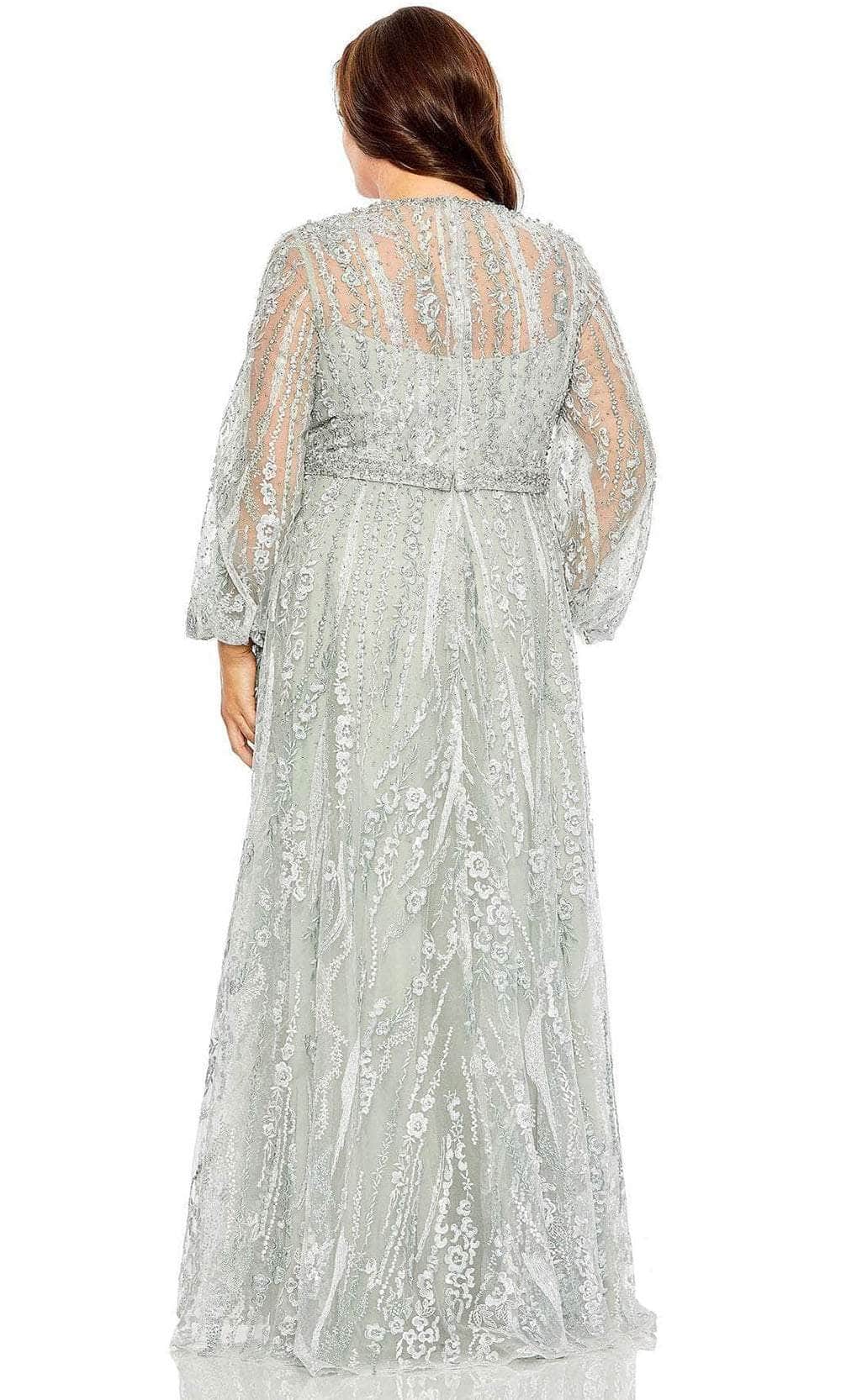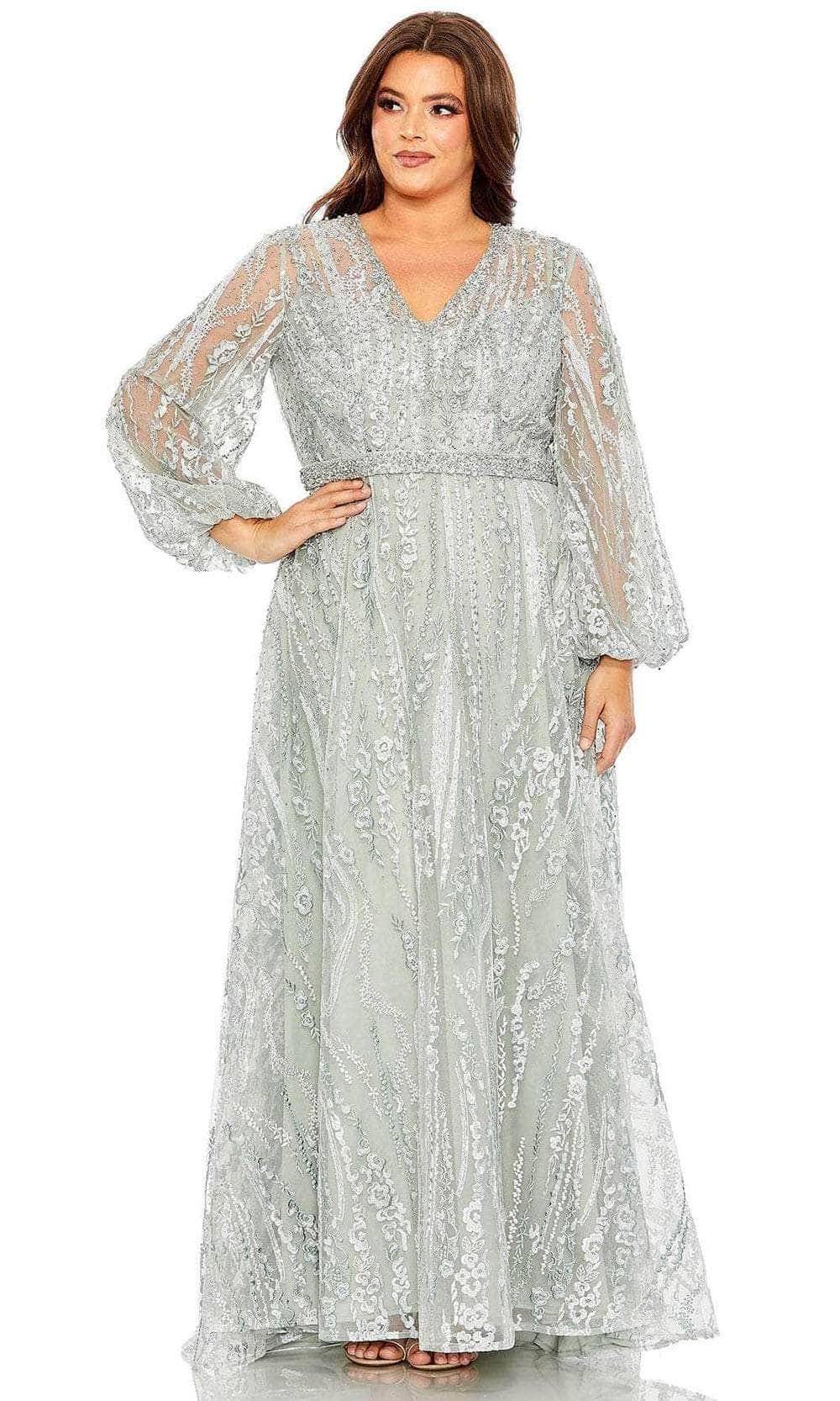 Make a statement with this Mac Duggal 20472 creation. The dress is adorned with a blend of embroidery and beading, giving it an absolutely amazing look. It features a thin waistband, long illusion bishop sleeves, and a v-neckline. A zipper fastening in the center of the partial illusion full back ensures a comfortable fit and effortless wear. The look finishes with an A-line skirt that gracefully falls to the floor. This Mac Duggal 20472 will definitely bring out the divinity in you! Models are wearing Mauve, and Seamist colors.