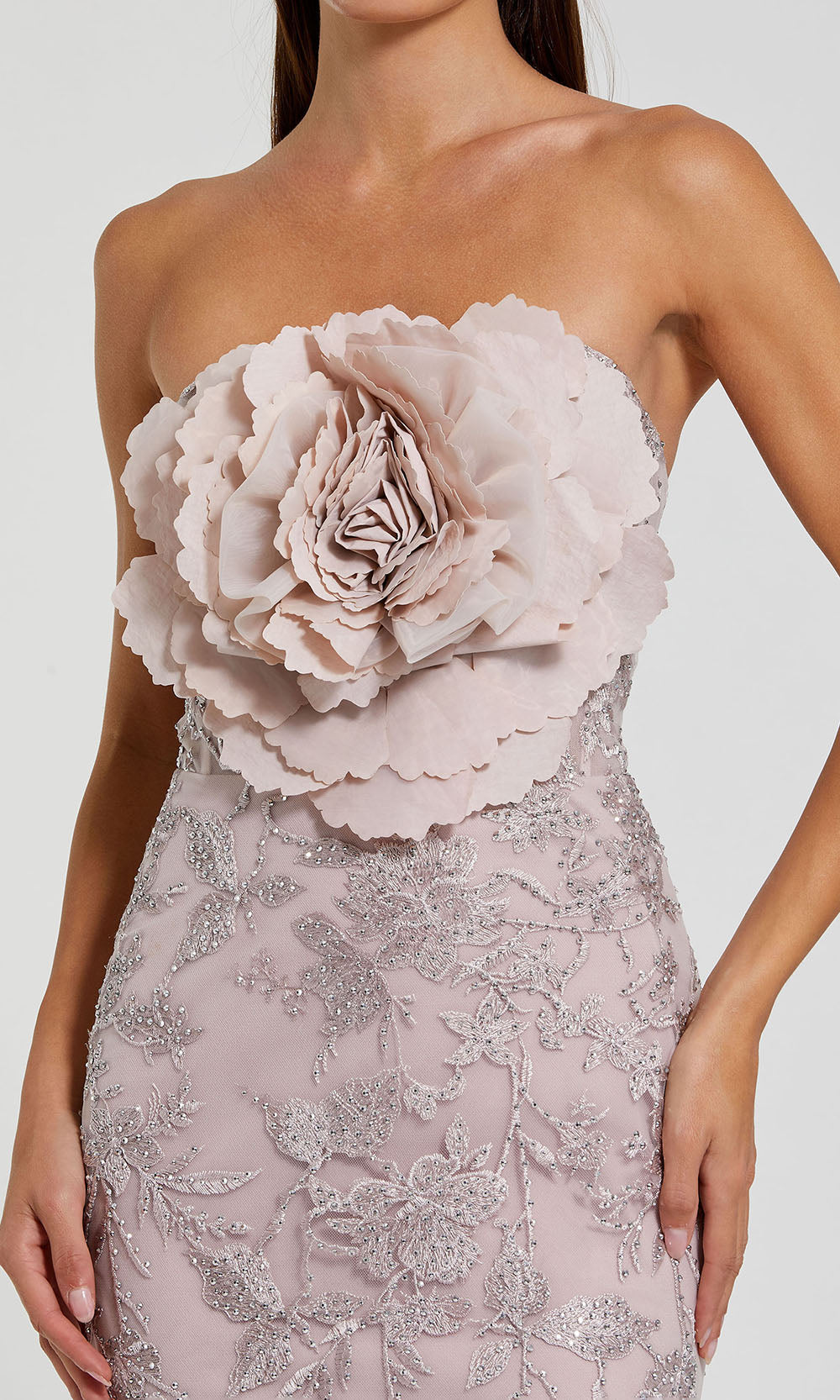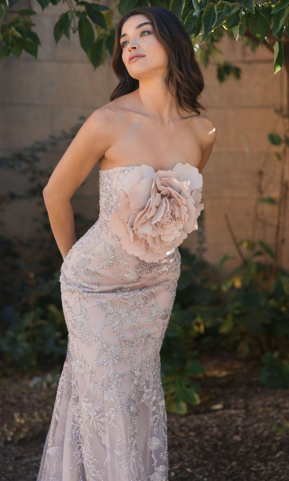 Delicate femininity meets standout couture in this Mac Duggal 21036 gown that turns every entrance into an event. It boasts a romantic aesthetic with its sweeping trumpet silhouette, accentuated by floral embroidery and beaded embellishments. The true focal point is the exaggerated 3D flower that anchors the strapless straight-across neckline, creating texture and volume in a sculptural flourish. Ideal for formal occasions that call for elegance with personality, Mac Duggal 21036 style delivers a fashion-forward twist on timeless glamour. Model is wearing Mocha color.