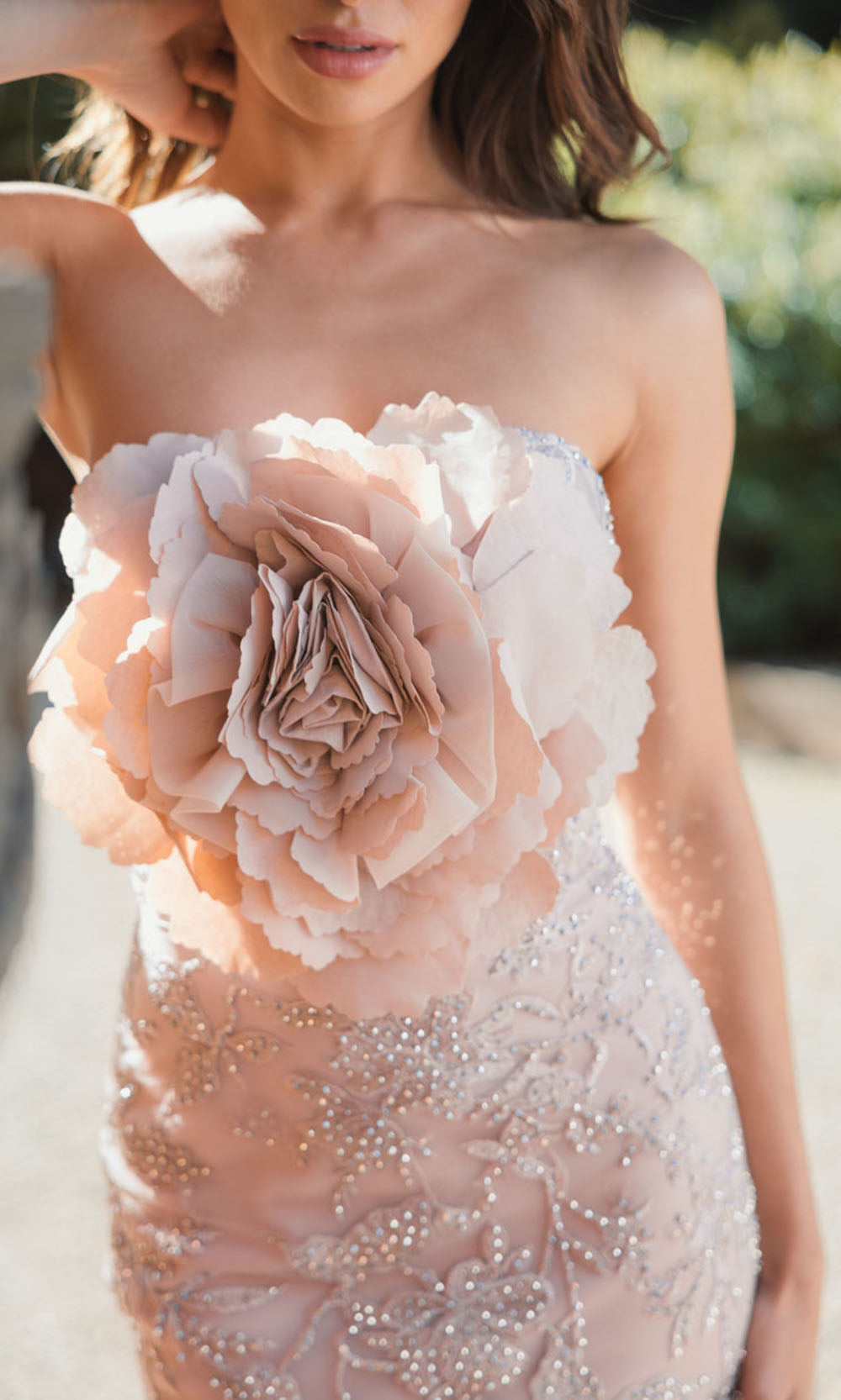 Details: | Exaggerated 3D Flower, Strapless, Embroidery, Beaded, Open Back, Sweep Train |
