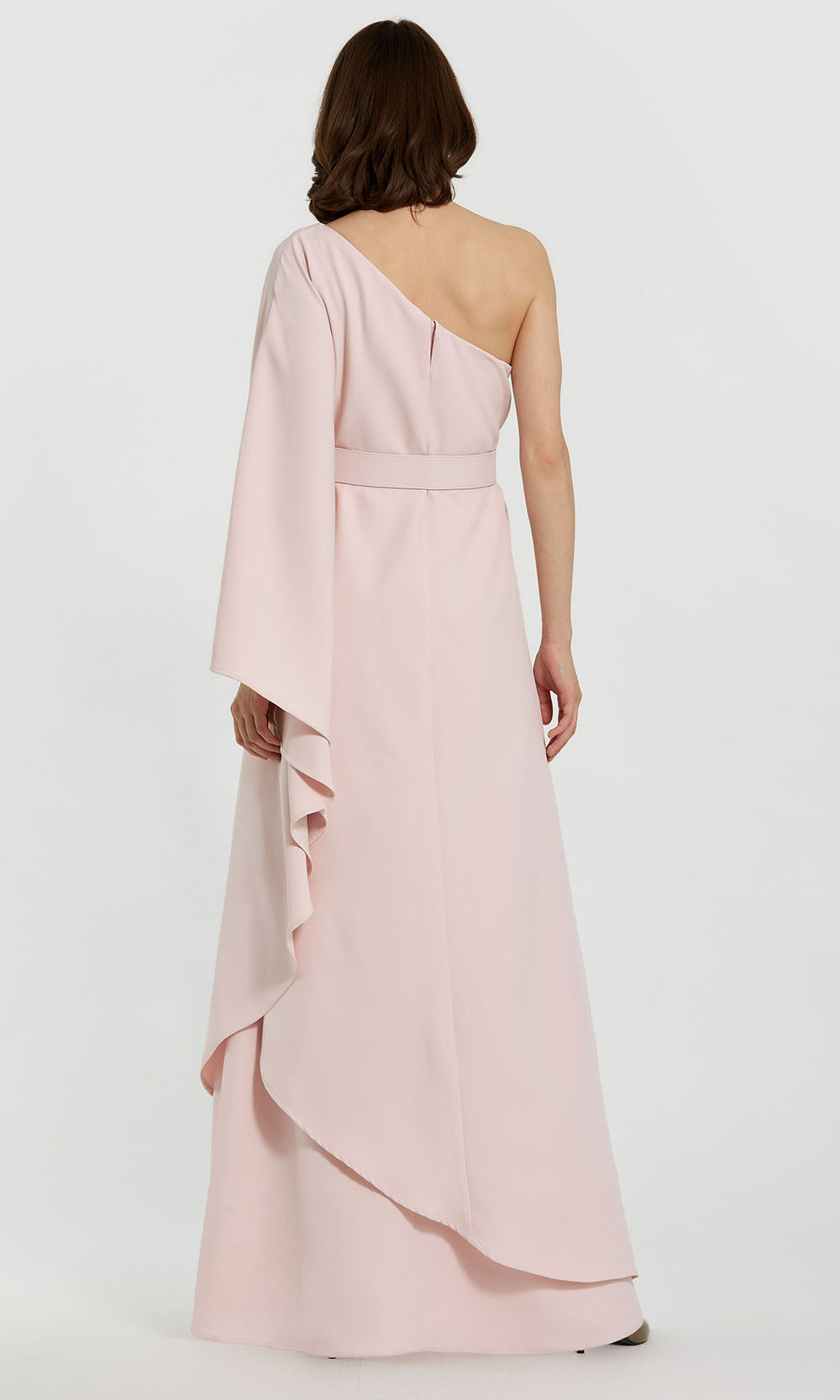 Make an unforgettable entrance in the Mac Duggal 21049, where asymmetry meets timeless draping in a stunning one-shoulder design with flowing crepe layers. The waist is highlighted by a buckled belt, giving way to a flowing skirt that drapes to the floor with elegance. Its A-line silhouette flatters a wide range of shapes, and the hidden zipper closure ensures a clean back profile. Fully lined for ease of wear, this gown embodies soft sophistication and refined tailoring. Mac Duggal 21049 is crafted to feel as effortless as it looks. Model is wearing Blush color.