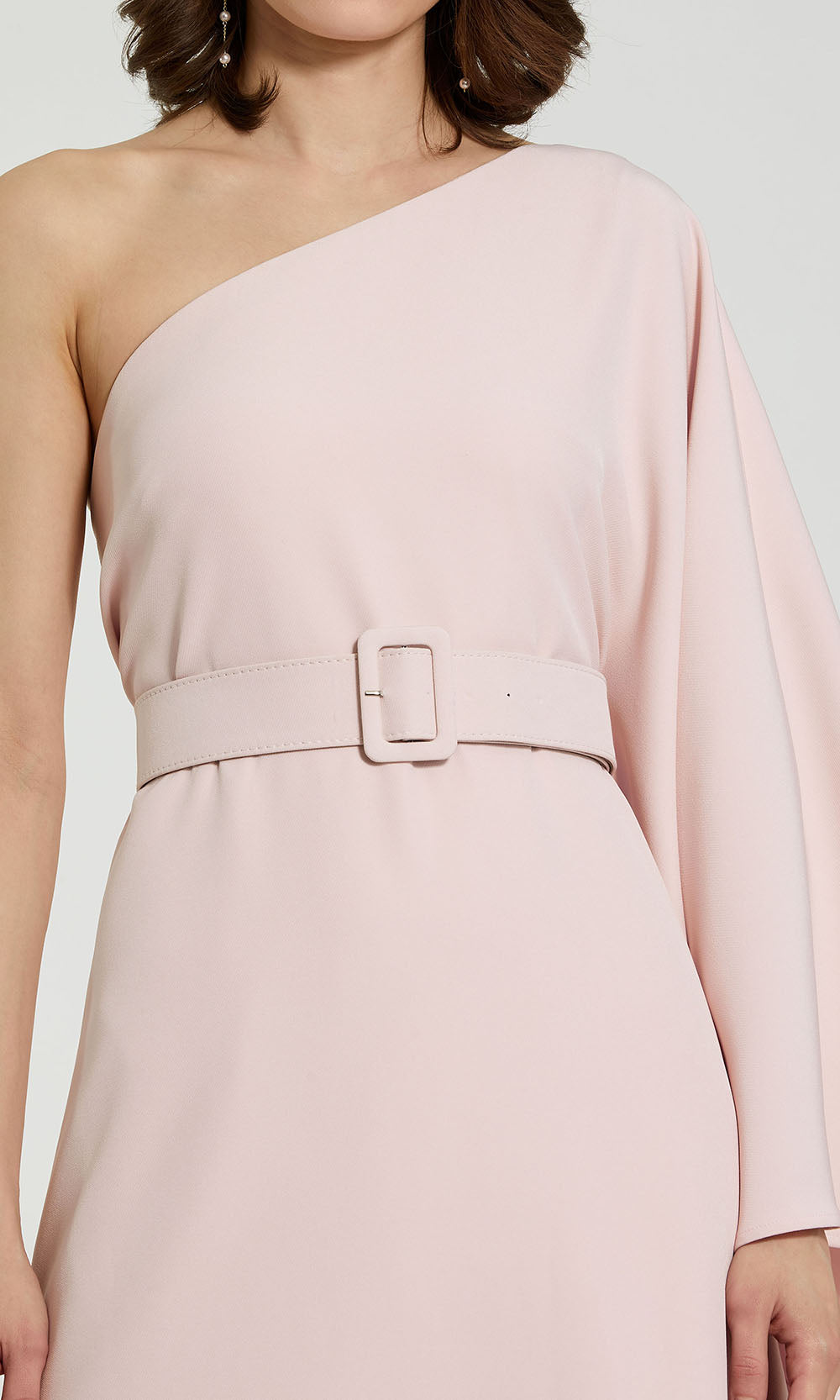 | Details: | One Shoulder Sleeve, Belted Waist, Mid-Open Back, Wrap Skirt |