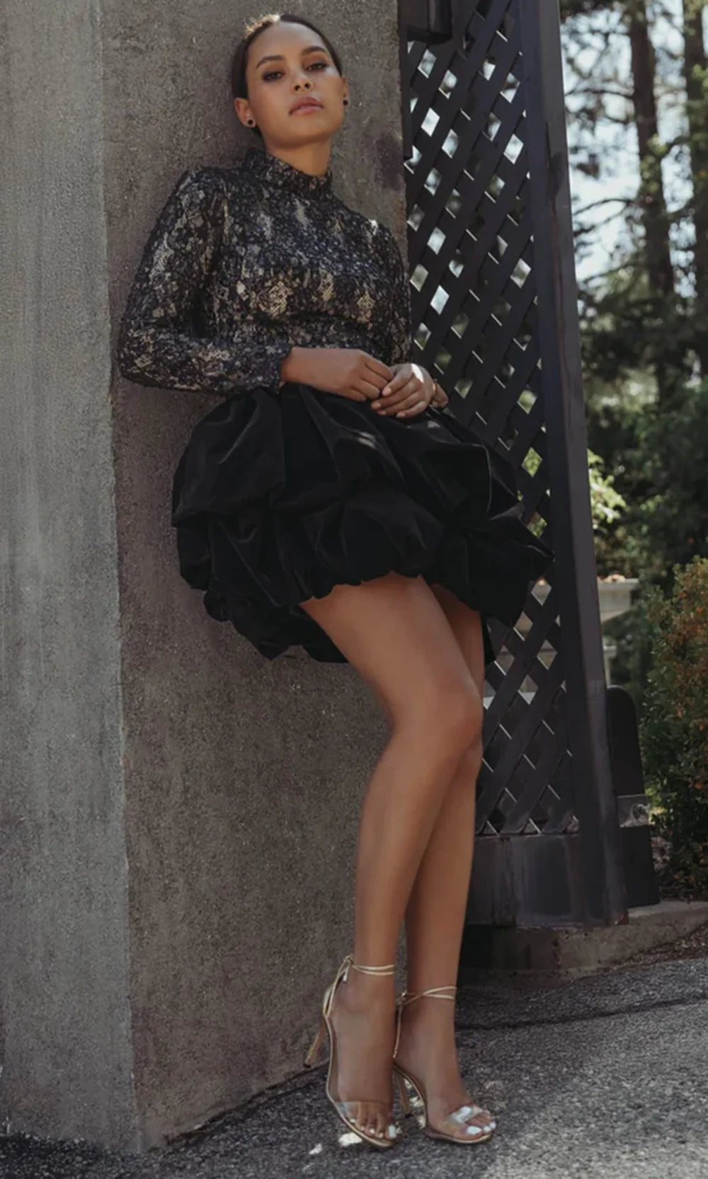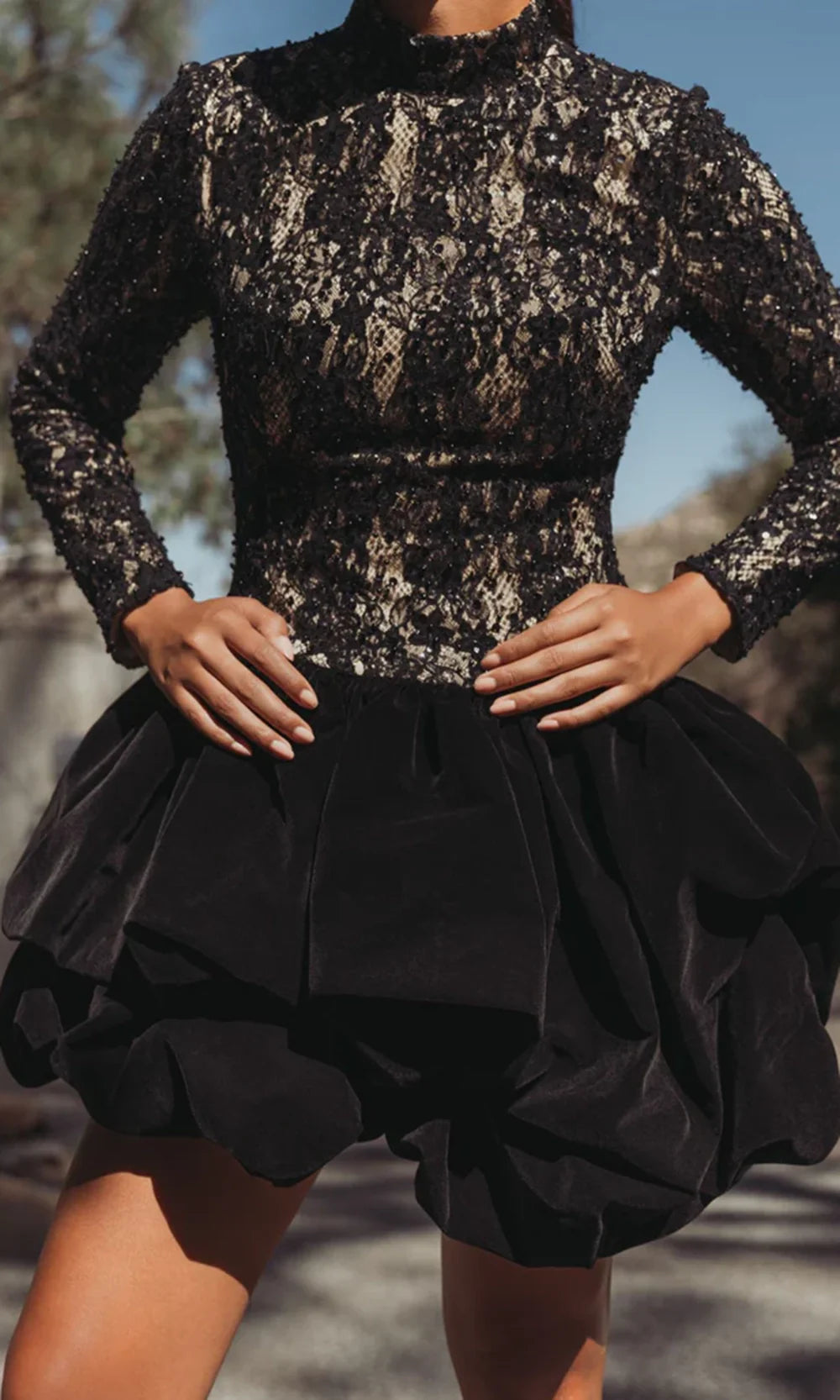 | Details: | Long Sleeves, Sequin Lace, Voluminous Bubble Skirt, Full Back, Concealed Back Zipper |