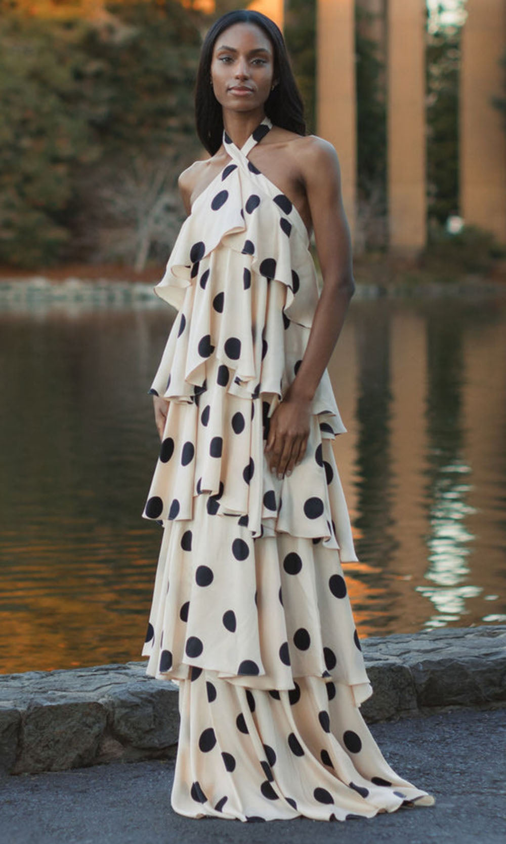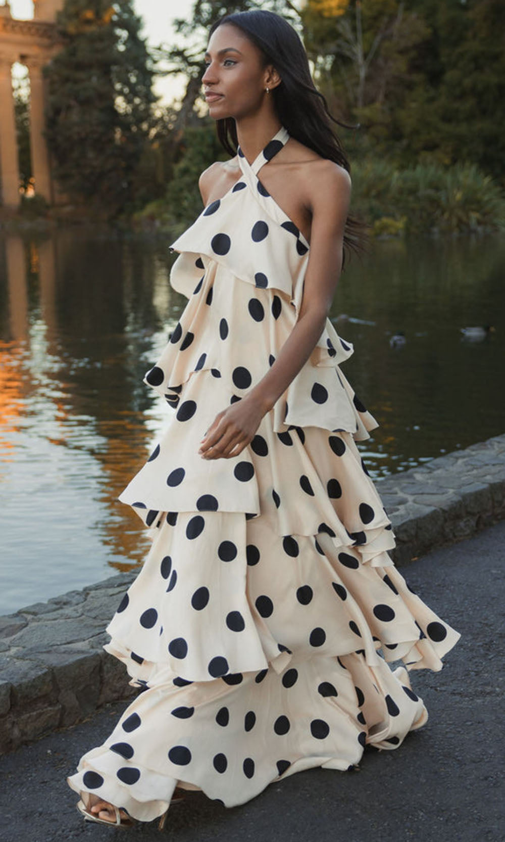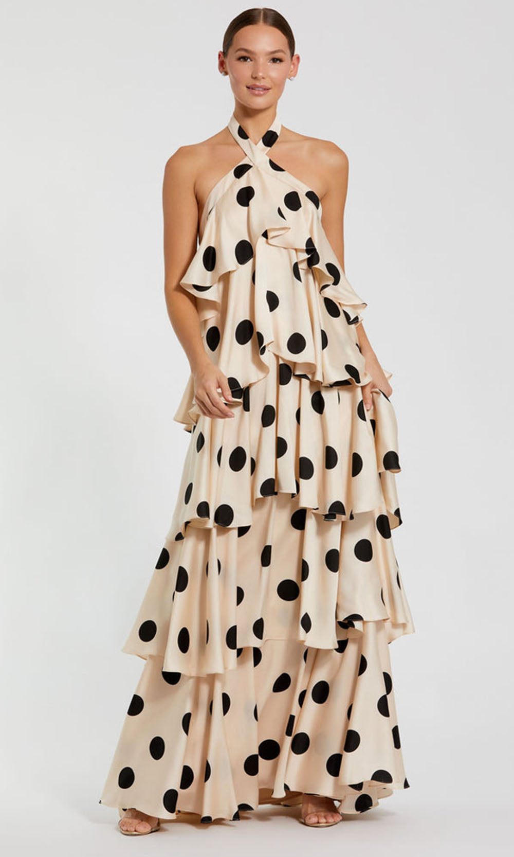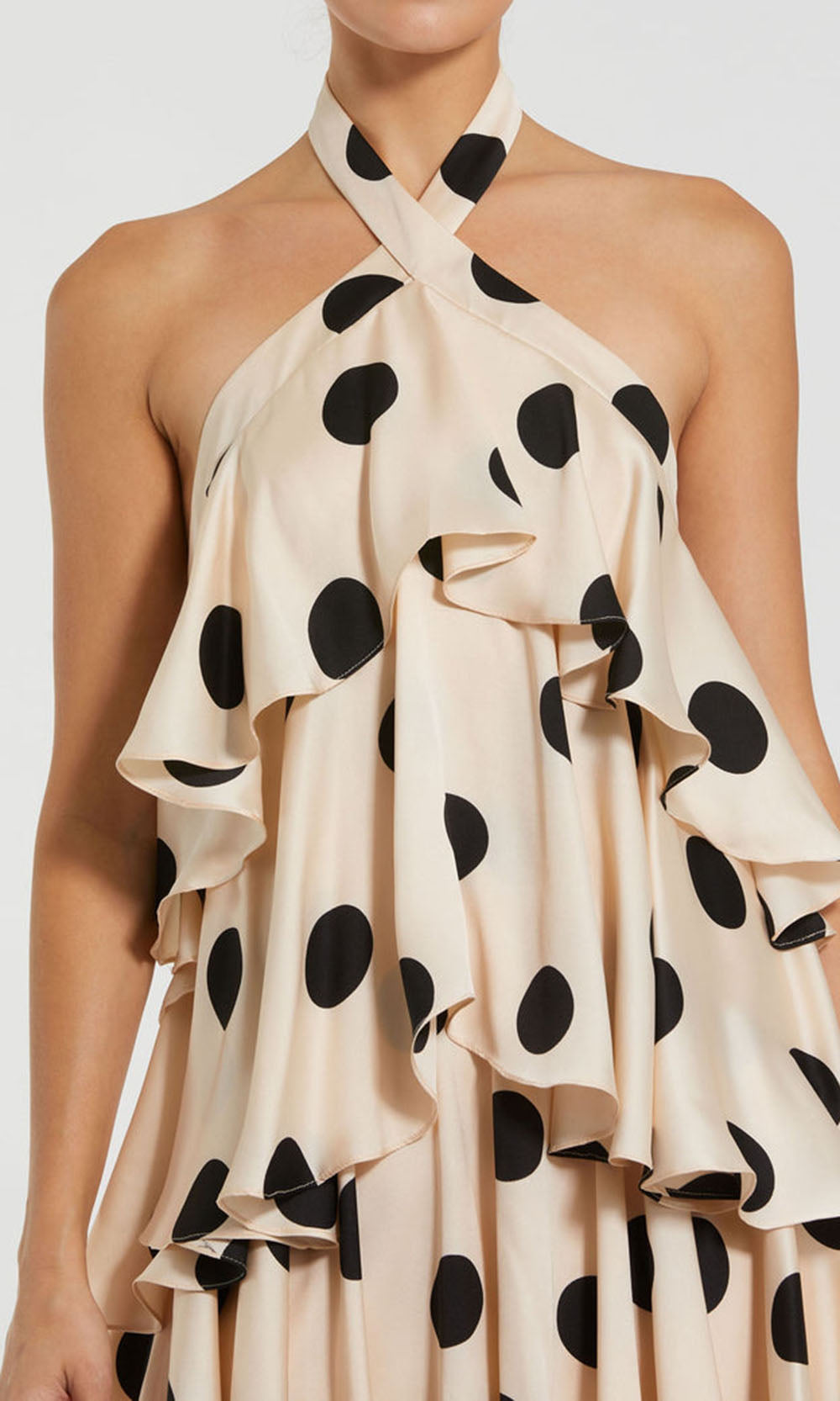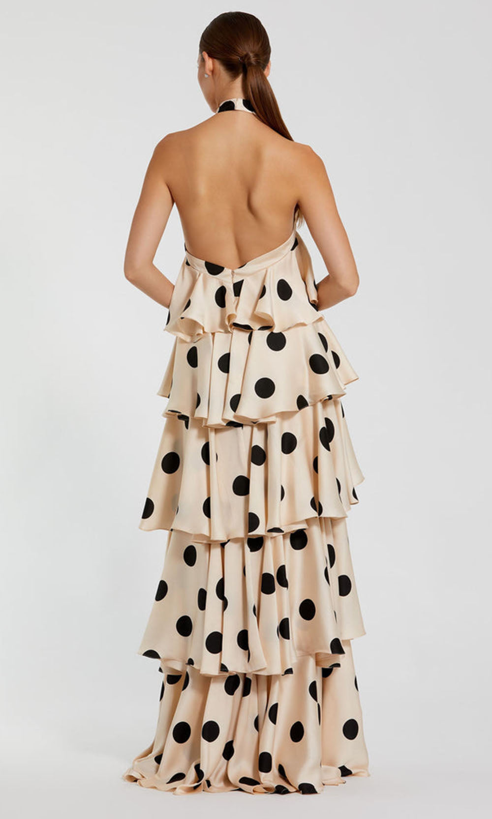 | Details: | Sleeveless, Polka Dot Print, Tiered Ruffles, Backless with Low Zipper, Floor Length |