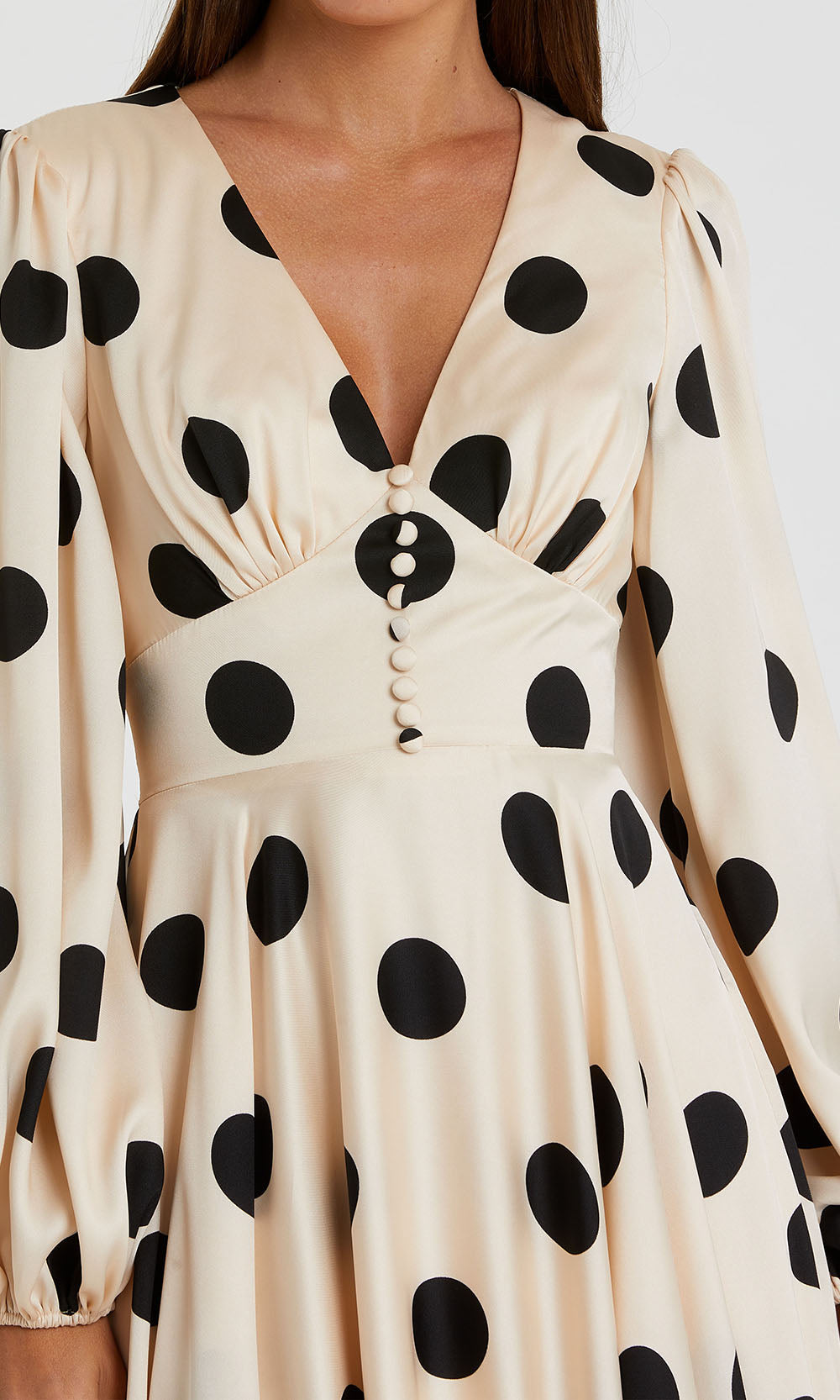 The Mac Duggal 27542 dress channels mid-century chic with an updated flair that is unmistakably contemporary. Charmeuse fabric is adorned with striking polka dots, arranged to accentuate the flow and curve of the tea-length skirt. A deep V-neckline with a button-front bodice creates a tailored yet soft focal point, while the ruched waist enhances its feminine structure. The long bishop sleeves introduce volume and elegance, balancing the playful print with subtle drama. Whether styled for day or evening, Mac Duggal 27542 creation offers a fresh perspective on classic glamour. Model is wearing Cream Black color.