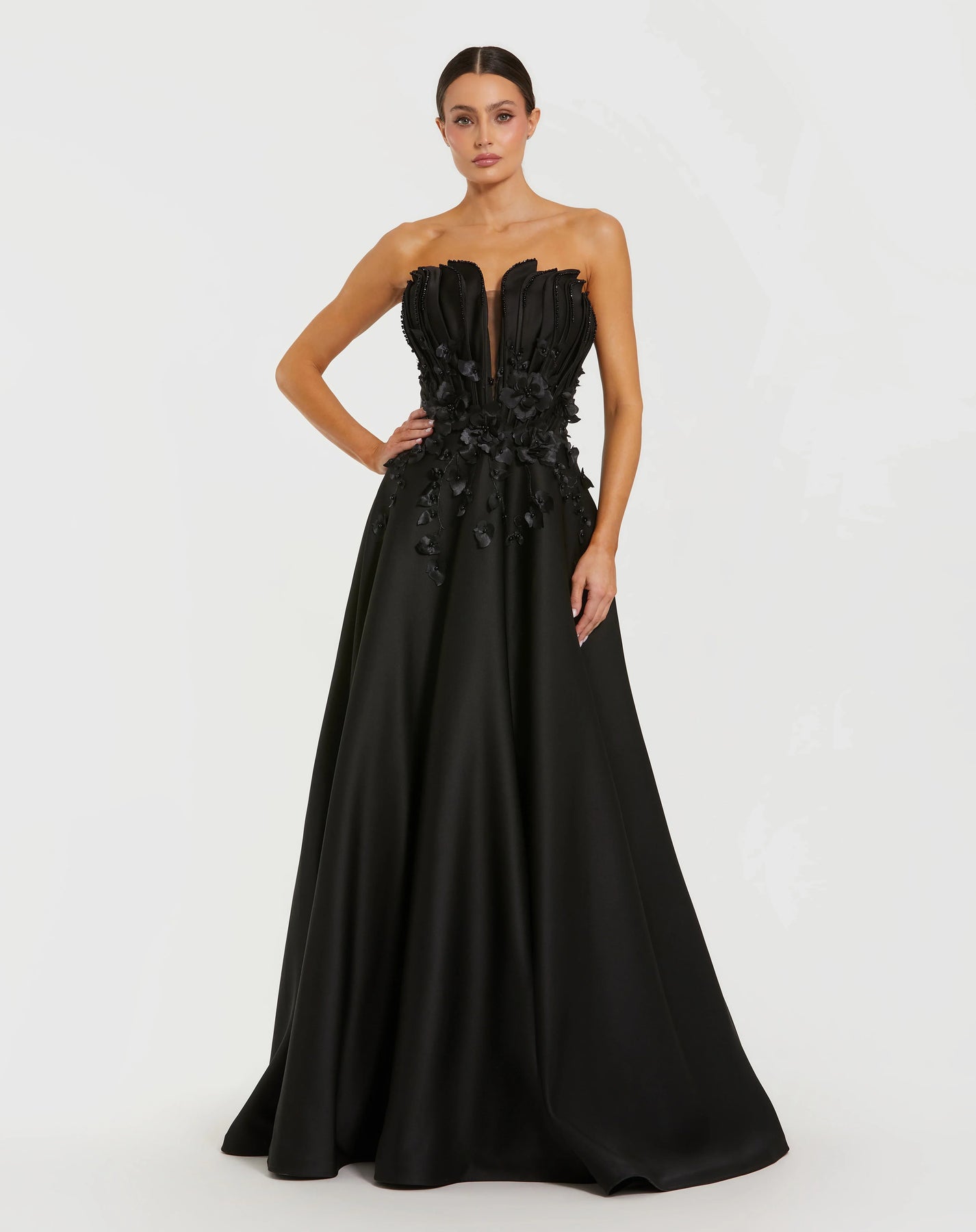 Structured beauty and intricate detailing make this Mac Duggal 37134 strapless gown truly stand out. The design is tailored with a plunging illusion sweetheart neckline, enriched with intricate 3D floral appliques and sparkling embellishments. The full-length A-line silhouette maintains poise while offering dramatic sweep. This gown flatters with a defined waist and smooth drape, making it a standout for formal celebrations. Bring texture, elegance, and presence to the room in the Mac Duggal 37134. Model is wearing Black color.