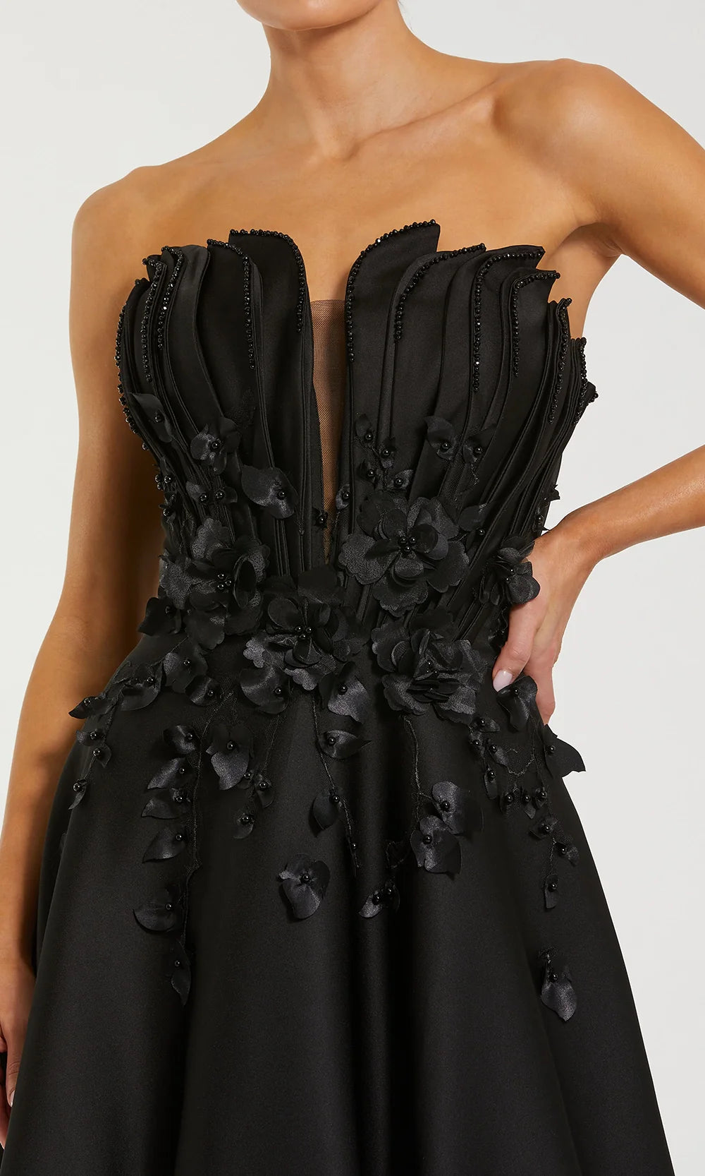 Details: | Strapless, Illusion Plunge Neckline, 3D Floral Appliques, Beaded, Open Back, Floor Length |