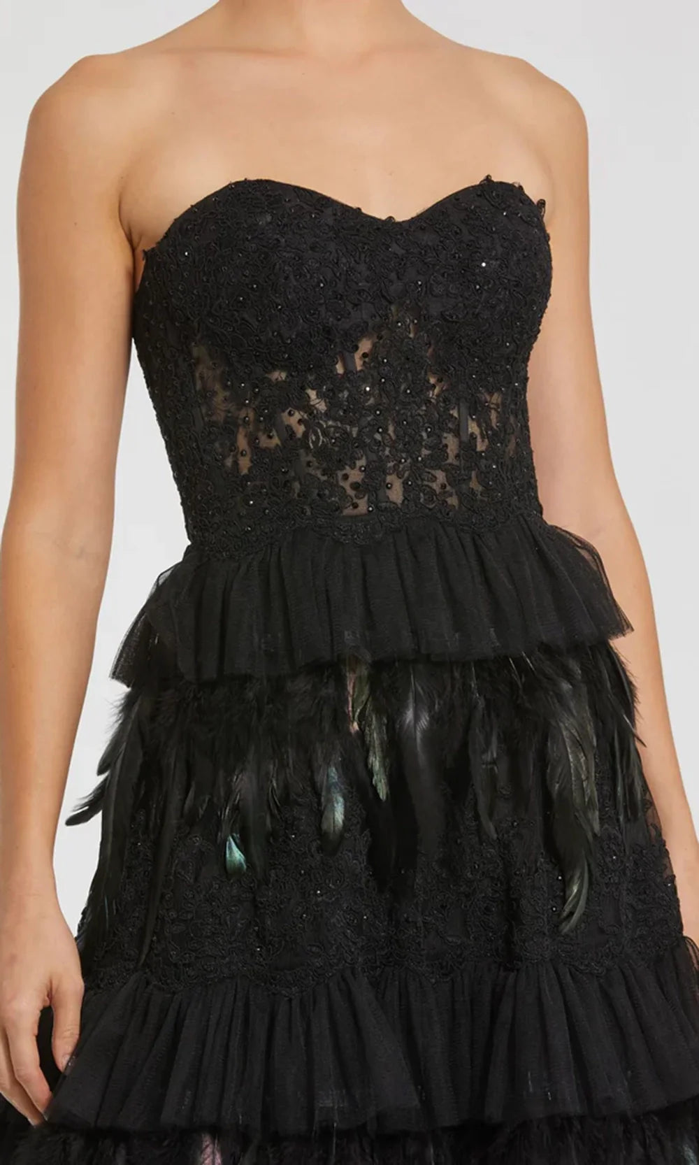 | Details: | Sheer Lace Corset Bodice, Strapless, Tiered Ruffle Skirt, Iridescent Feather Accent, Concealed Back Zipper |