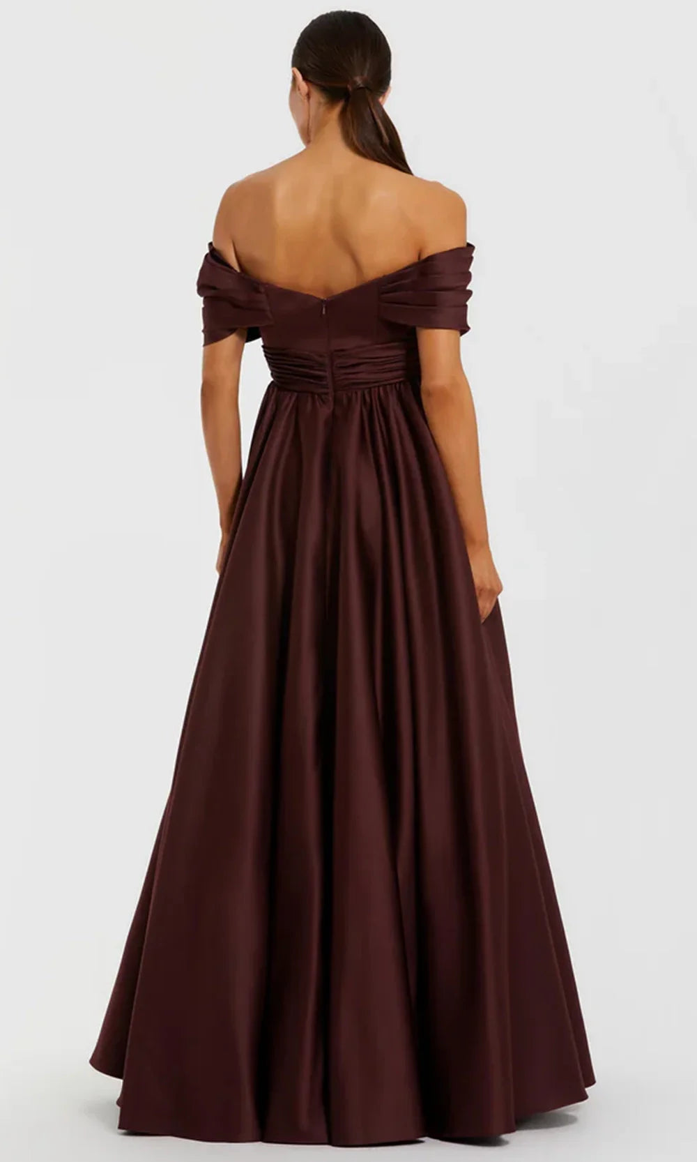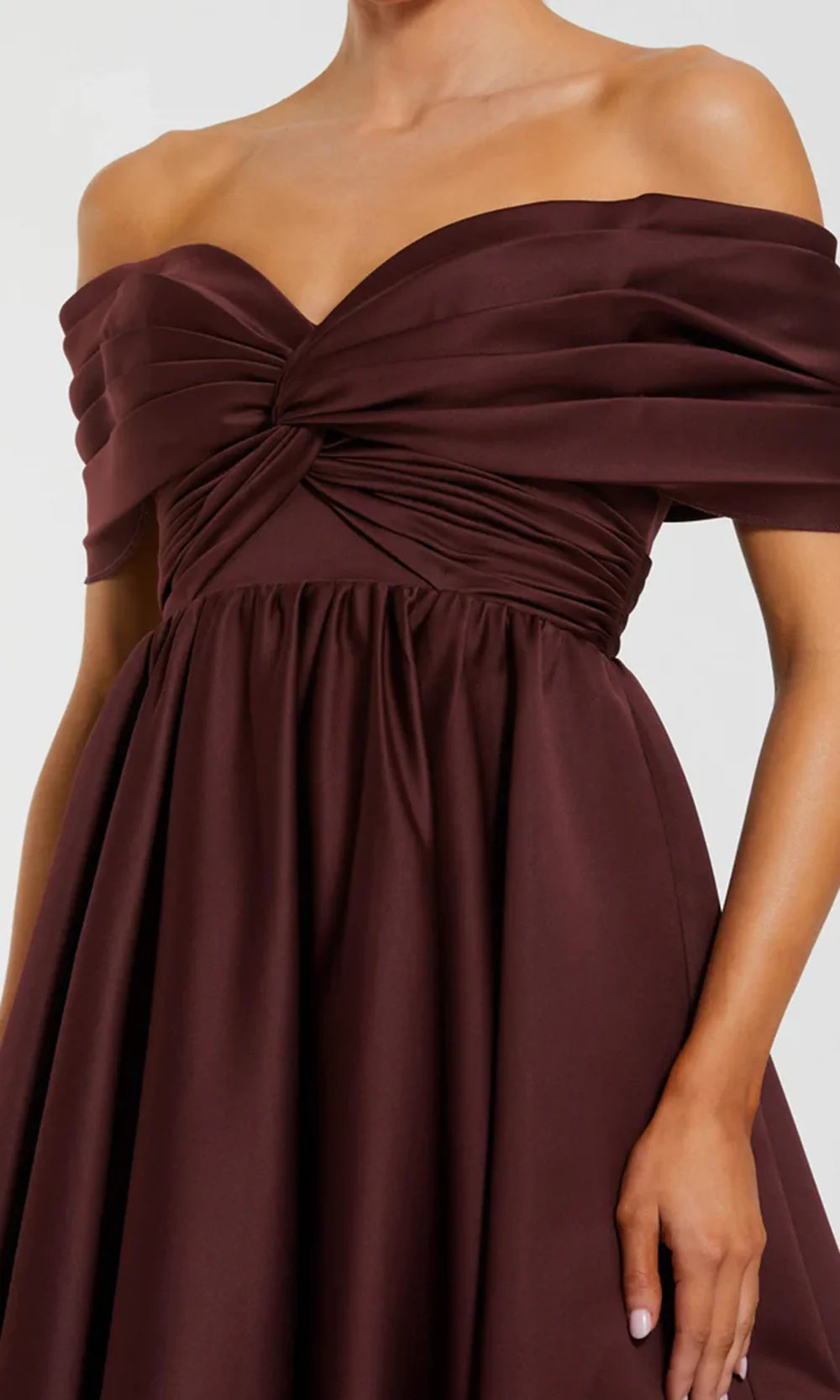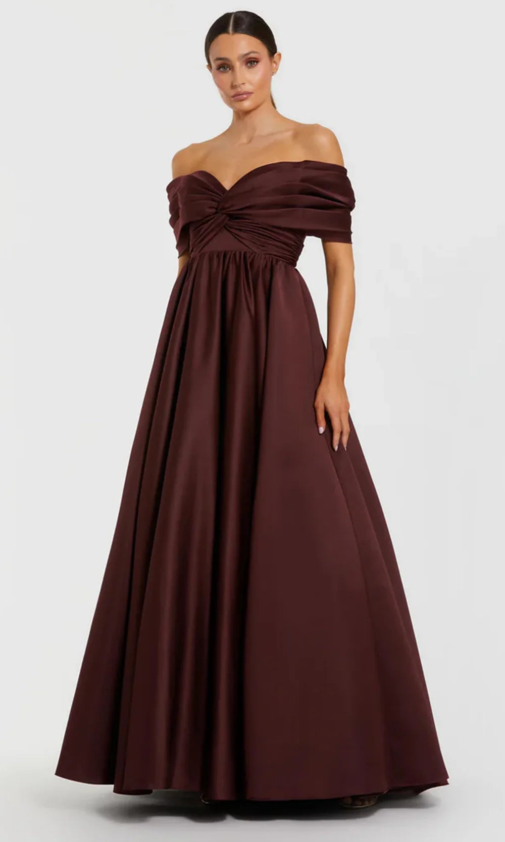 The Mac Duggal 56188 captures the essence of elevated glamour with effortless allure. Its off shoulder neckline and beautifully twisted bodice create a flattering shape that draws the eye to the natural waist. The satin fabric cascades into a full ballgown skirt, exuding grace with each movement. A concealed back zipper keeps the fit clean and structured, while the design exudes understated luxury. Perfect for gala evenings or red carpet occasions, the Mac Duggal 56188 offers an unforgettable blend of sophistication and charm. Model is wearing Win color.