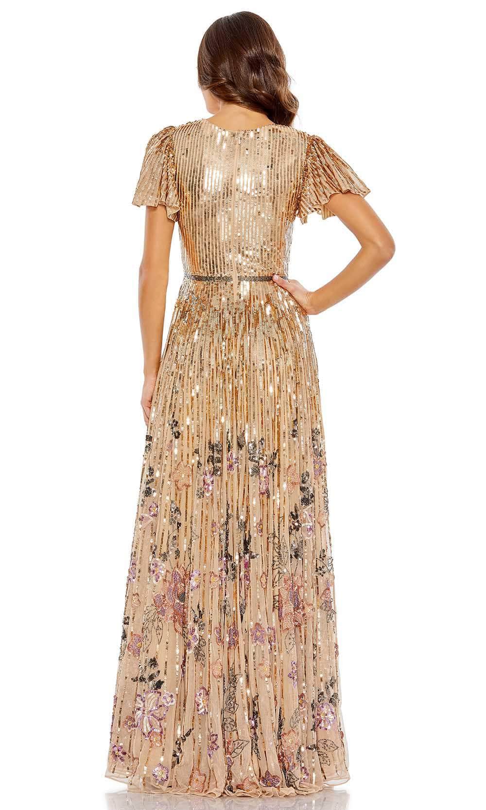 Wearing the Mac Duggal 5637 dress is a surefire way to turn heads and win hearts. This dress is made of mesh fabric that is adorned with sequins, so it catches the light as the wearer walks, providing a hypnotic effect. The short flounce sleeves and V-neckline give this dress a graceful air. The beaded accent at the waist emphasizes your curves. The back zipper maintains a snug fit, and the sequins on the skirt's flower details offer a touch of whimsy. This Mac Duggal 5637 masterpiece will be the center of attention at any formal event. Model is wearing Copper color.