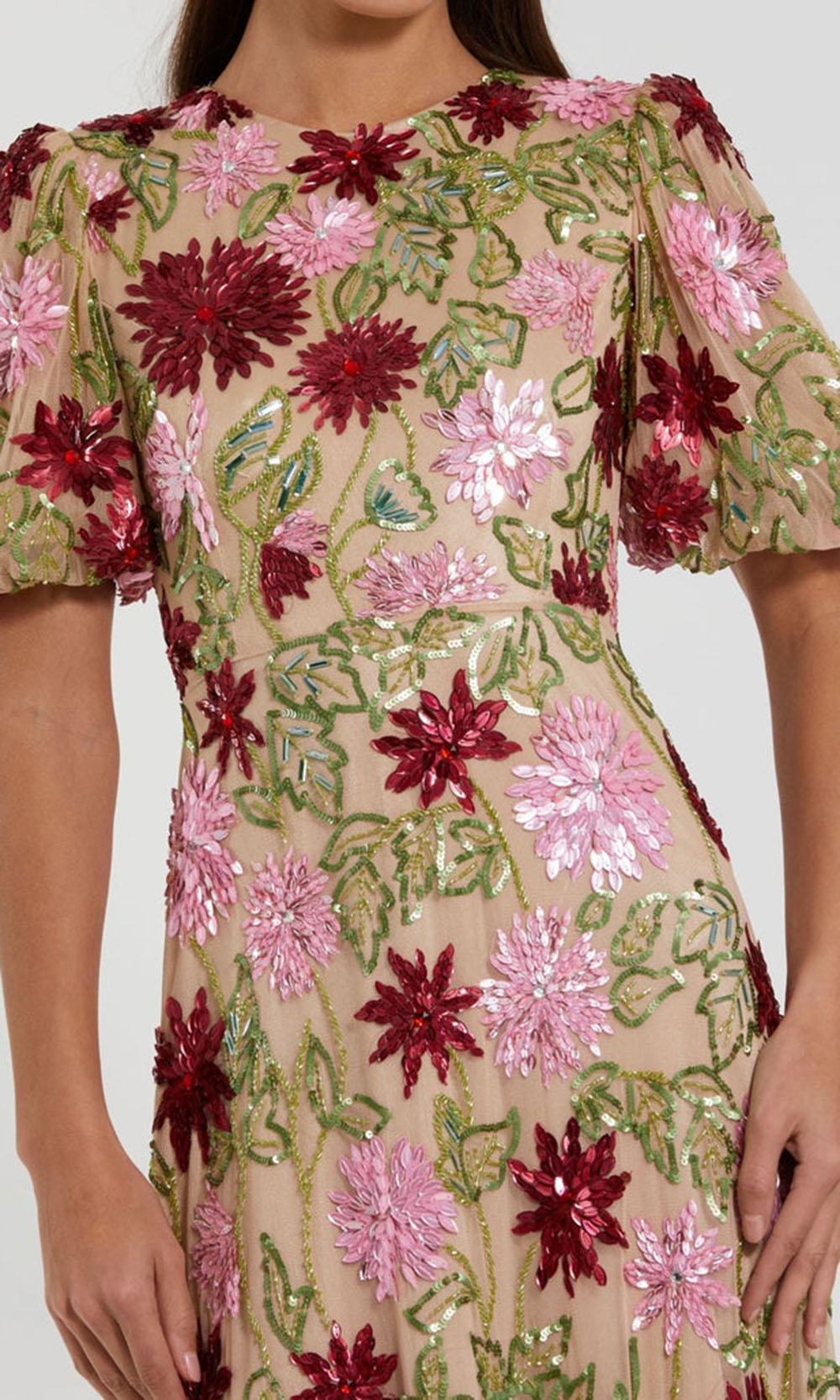 Feminine florals meet timeless tailoring in the Mac Duggal 6125, an A-line gown that brings softness and structure into perfect harmony. The nude-toned base is embroidered with vibrant floral motifs of beaded and sequins, offering a multidimensional texture that catches the light. Its jewel neckline, short puff sleeves, and natural waistline contribute to a refined silhouette that flatters without overwhelming. Ideal for black-tie events or formal weddings, the Mac Duggal 6125 masterpiece ensures you are dressed with poise and personality. Model is wearing Nude Multi color.