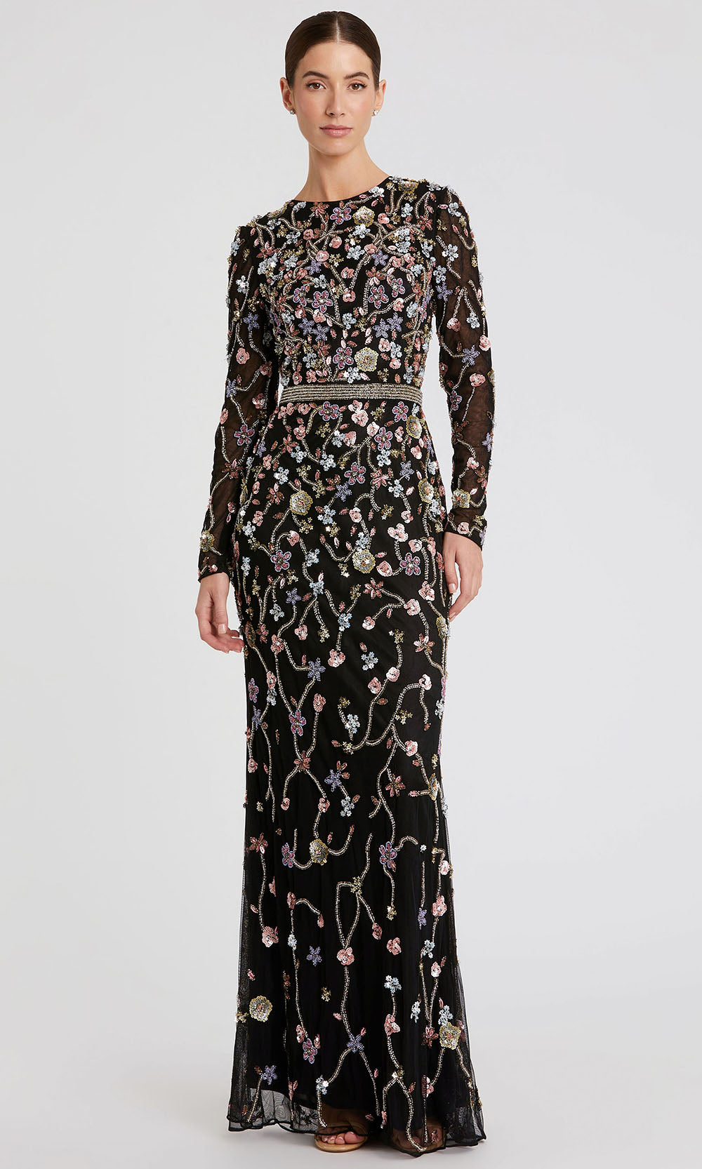 | Details: | Floral Embellishments, Long Sleeves, Beaded Waistline, Full Back, Back Zipper Closure |