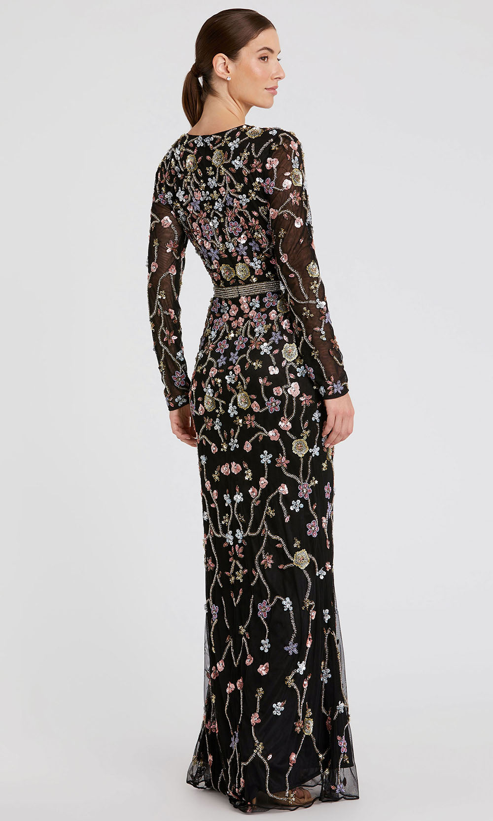 Draw interest in yourself in the Mac Duggal 6135 dress, an exquisite design featuring colorful, multicolored sequins set in a mesmerizing flowery pattern. This gorgeous dress has a full back and long sleeves, which are fastened with a center zipper for an impeccable fit. The floor-length skirt radiates sophistication and elegance as it flows elegantly in the shape of a column. The Mac Duggal 6135 dress is ideal for special occasions and formal gatherings because of its exquisite detailing and classic appeal. Model is wearing Black Muti color.