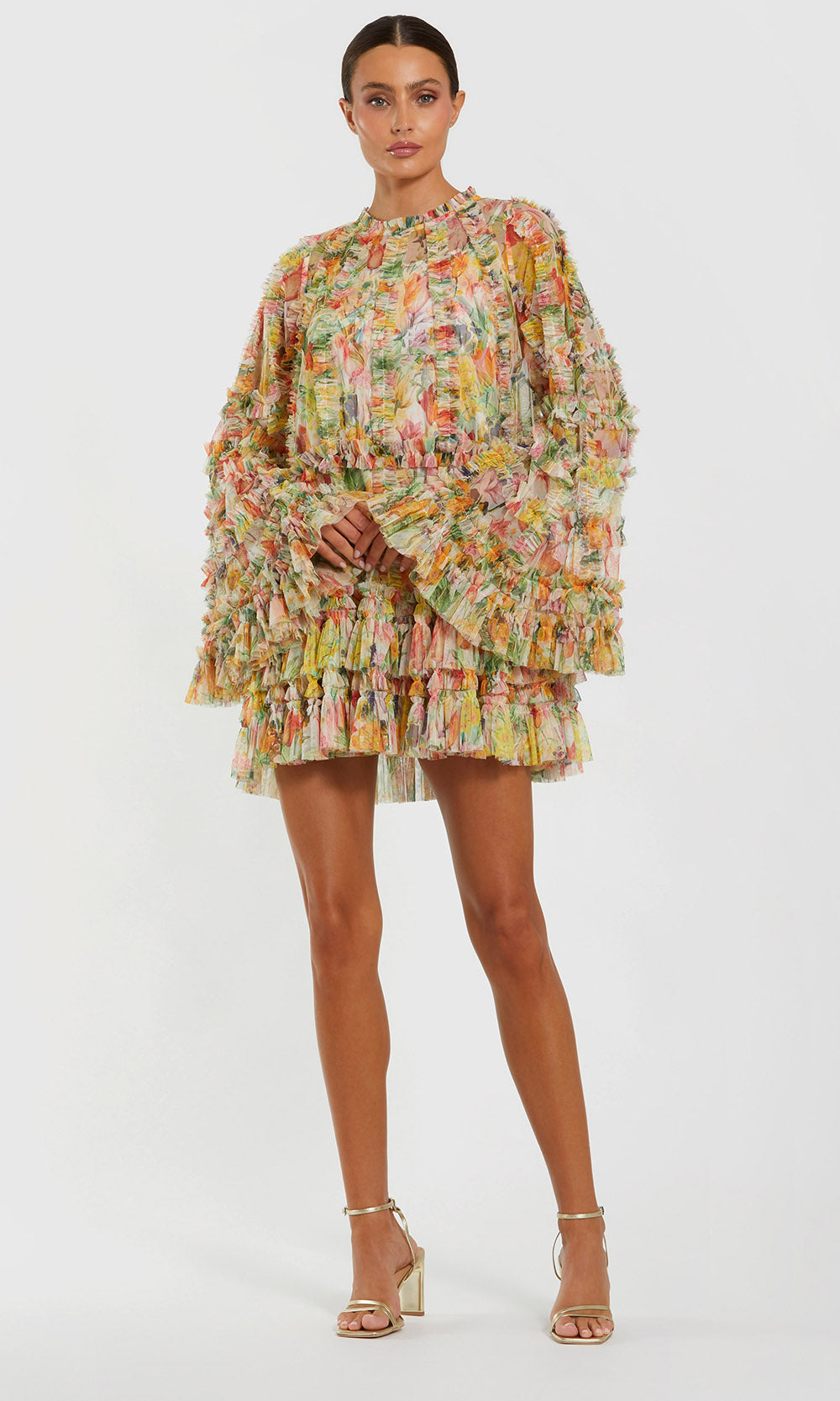 Imbued with a sense of artistic spontaneity, this Mac Duggal 8300 mini dress fuses texture and movement in a truly unique form. The all-over ruffled fabric with floral prints creates depth and visual intrigue, while the long bell sleeves and high neckline lend a hint of theatrical charm. Designed with intention yet brimming with energy, it is a piece that embraces contrast, soft structure, bold detailing, and fluid motion. Ideal for curated events or creative gatherings, this Mac Duggal 8300 look captures the intersection of joy, confidence, and boundary-pushing design. Model is wearing Ivory Multi color.
