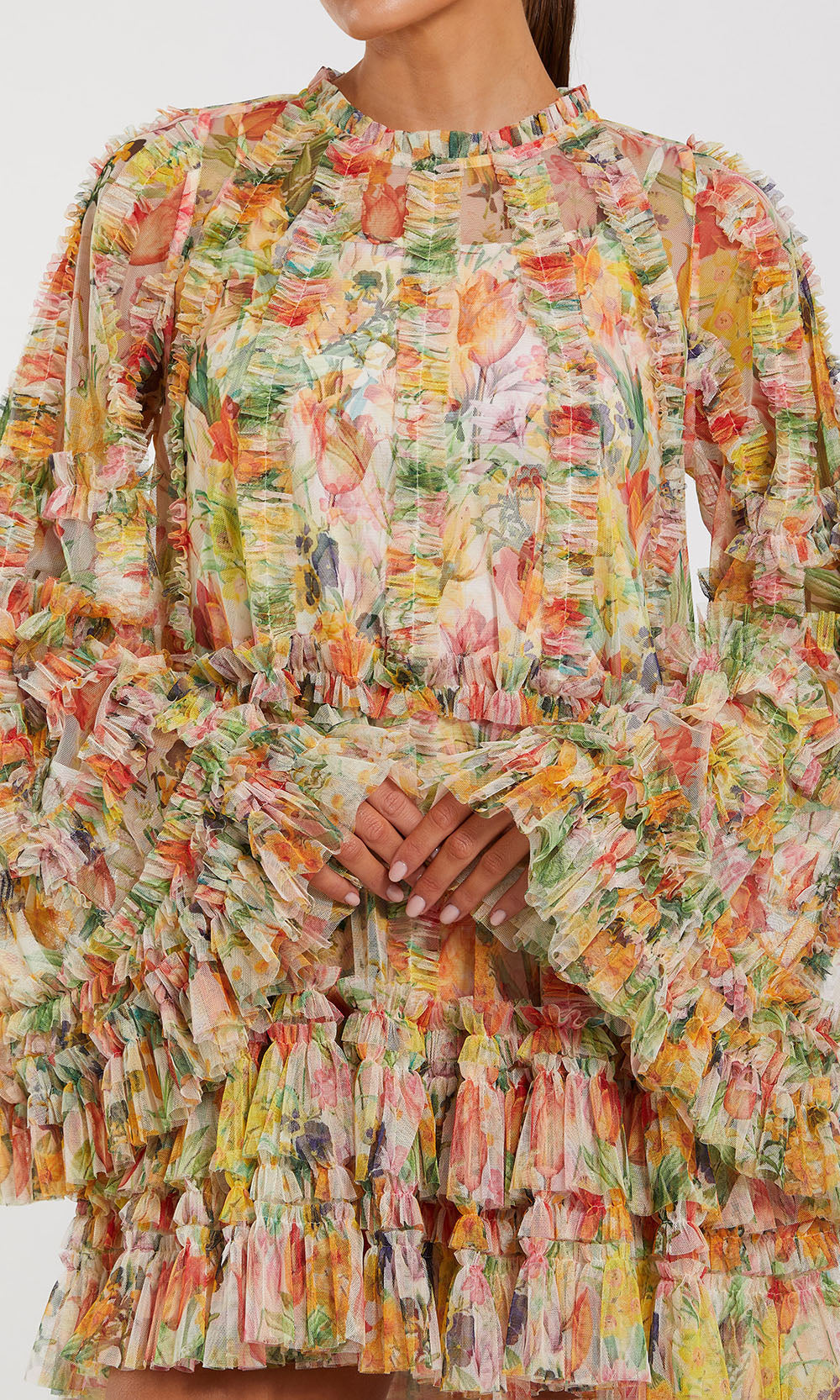 | Details: | Floral Prints, Long Bell Sleeves, Tiered Ruffle Detail, Concealed Back Zipper |