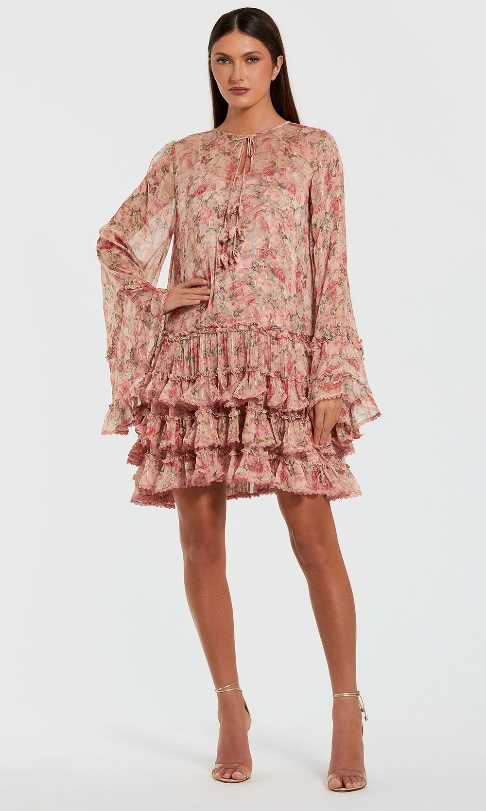 Step into the spotlight with the Mac Duggal Style 8336, a dress that captures the essence of modern femininity. This mini dress is crafted from luxurious viscose fabric adorned with subtle gold flecks, offering a radiant glow. The high neckline with tie closure and long flare sleeves exude elegance, while the ruffle tiered A-line skirt adds movement and flair. Designed as a pullover dress with sheer unlined sleeves and a fully lined skirt, it combines style with comfort. Whether attending a brunch or a cocktail party, the Mac Duggal 8336 dress ensures you make a lasting impression. Model is wearing Pink Multi color.