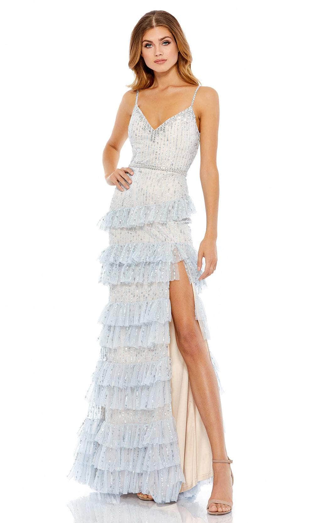 Shine effortlessly in the Mac Duggal 9116, a breathtaking gown embellished with shimmering sequins for a touch of elegance and sophistication. The sleeveless bodice features a flattering V-neckline, while crisscross straps at the back add a captivating element of allure. A concealed back zipper ensures a secure fit, while the ruffled floor-length skirt glides beautifully in a sheath silhouette, accented with a bold slit for added flair. Ideal for formal events, the Mac Duggal 9116 promises a memorable, show-stopping look. Model is wearing Powder Blue color.