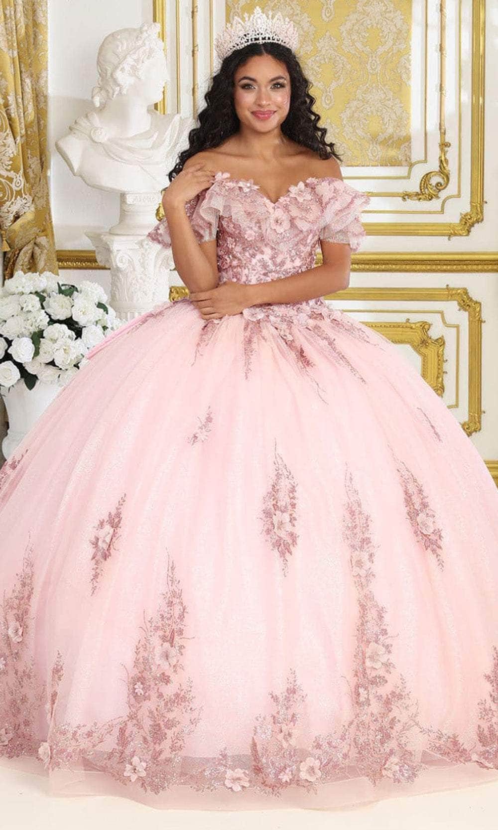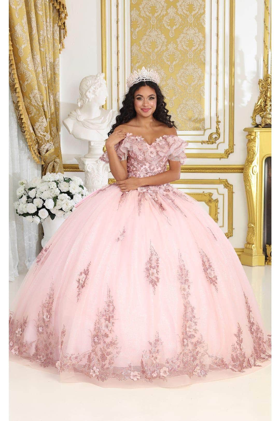 Experience the opulent charm of this Quinceanera May Queen LK233 ballgown. Lavishly adorned with shimmering accents and intricate embroidery adorning the bodice, this gown showcases a ruffled foldover panel that elegantly complements the off-shoulder neckline. Embellished with metallic lace details, the back presents a midrise design with a corset ensuring an impeccable fit, along with an oversized bow accent. Layers of fabric cascade gracefully, shaping a mesmerizing ballgown silhouette with a sweeping train. Immerse yourself in the splendor of your special day with our extraordinary Quinceanera May Queen LK233 masterpiece. Model is wearing the Pink color.