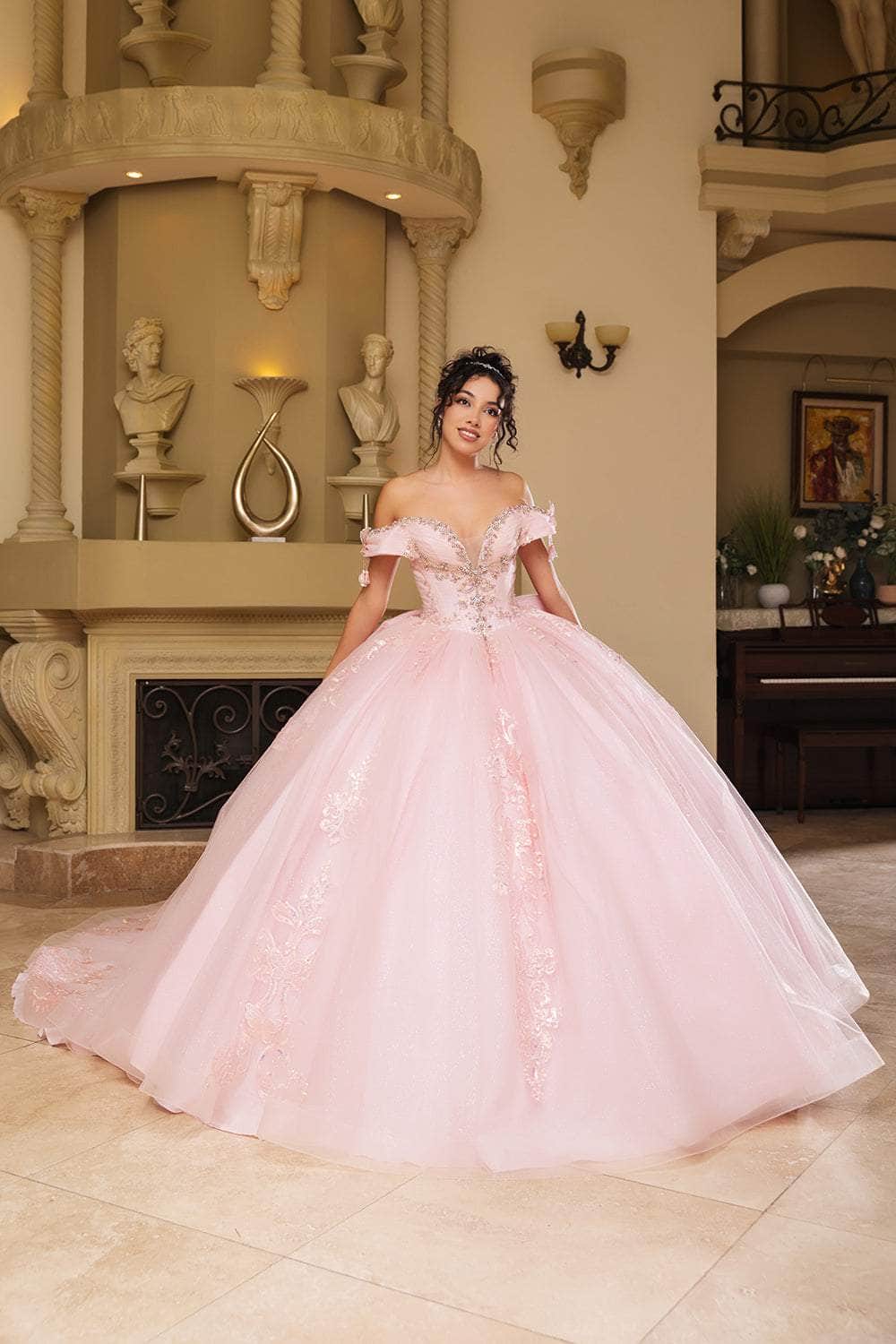 Command attention in the magnificent May Queen LK274, a gown designed for grandeur. The baroque beaded embroidery enriches the fitted corset bodice, beautifully complemented by delicate floral appliques. Featuring a lace-up back and off-shoulder sweetheart neckline, this gown flatters from every angle. The voluminous ballgown skirt sweeps the floor, adding royal elegance to your event. Dramatic oversized bow at the back adds the perfect finishing touch. The May Queen LK274 is a celebration of classic luxury, perfect for creating timeless memories. Models are wearing Blush, and Red colors.