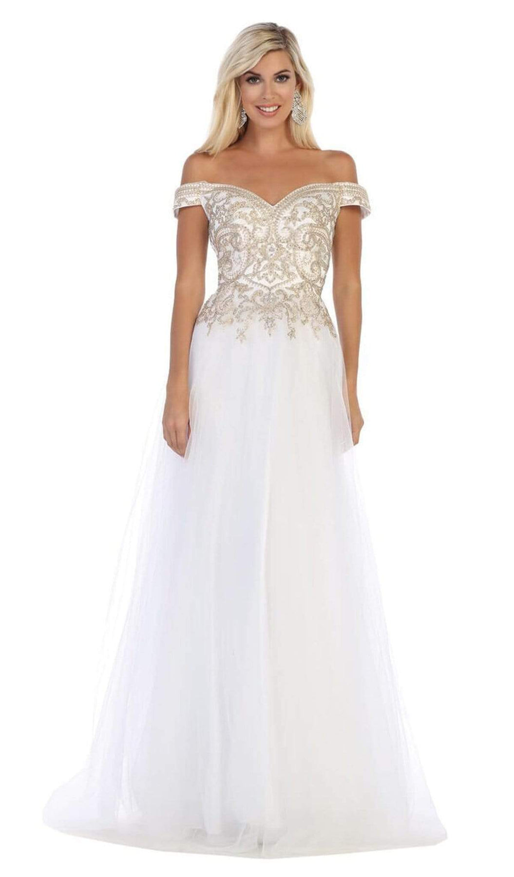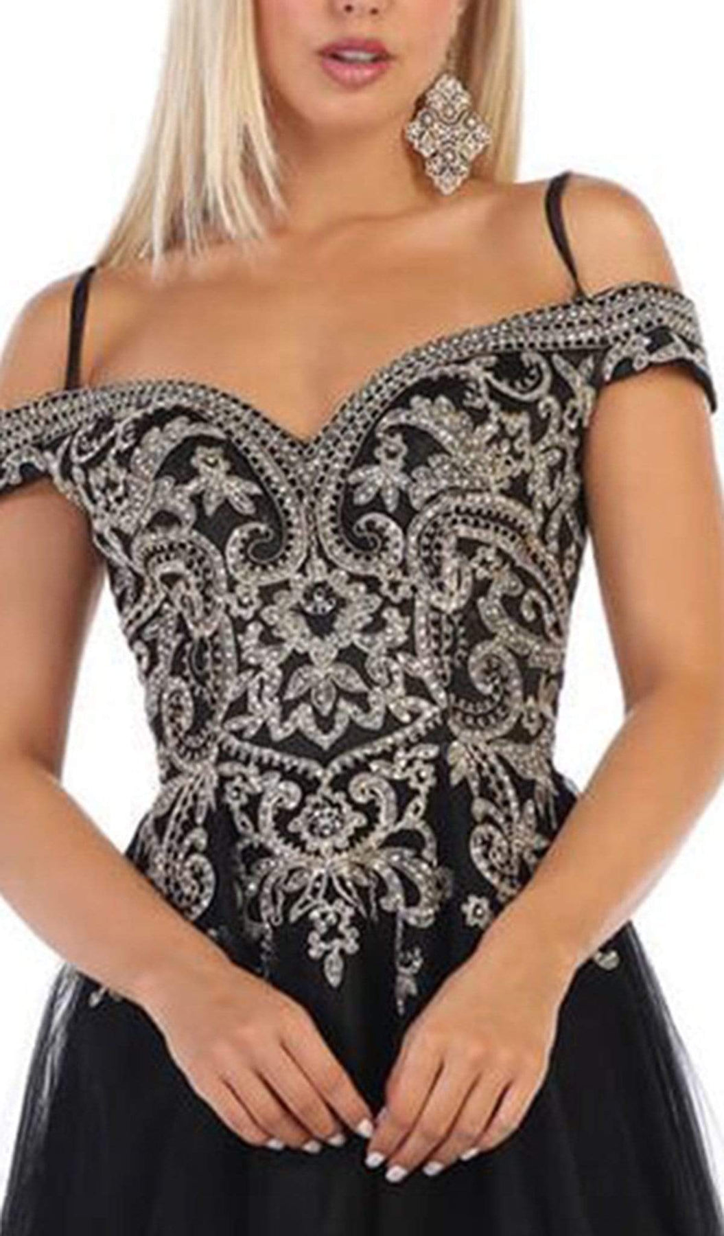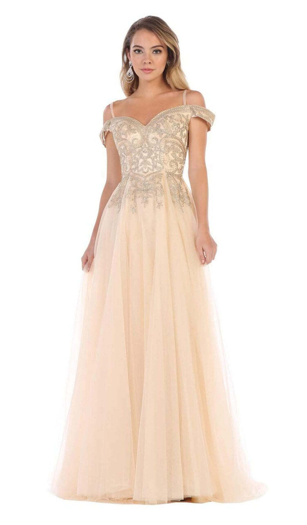 When you wear this May Queen MQ1626 you are guaranteed to have the night of your life. This amazing outfit flatters with an off shoulder neckline and a sweetheart notch dangling from spaghetti straps and is intricately made with lace appliques accented with gems. The gossamer A line skirt streams over the waist with shimmering filigree details until it meets the floor with an Impressive train, defined by an elaborate mid open back. Electrify the crowd by spreading your radiance across the room with this May Queen MQ1626 creation. Models are wearing the Black, Blush and Champagne colors.