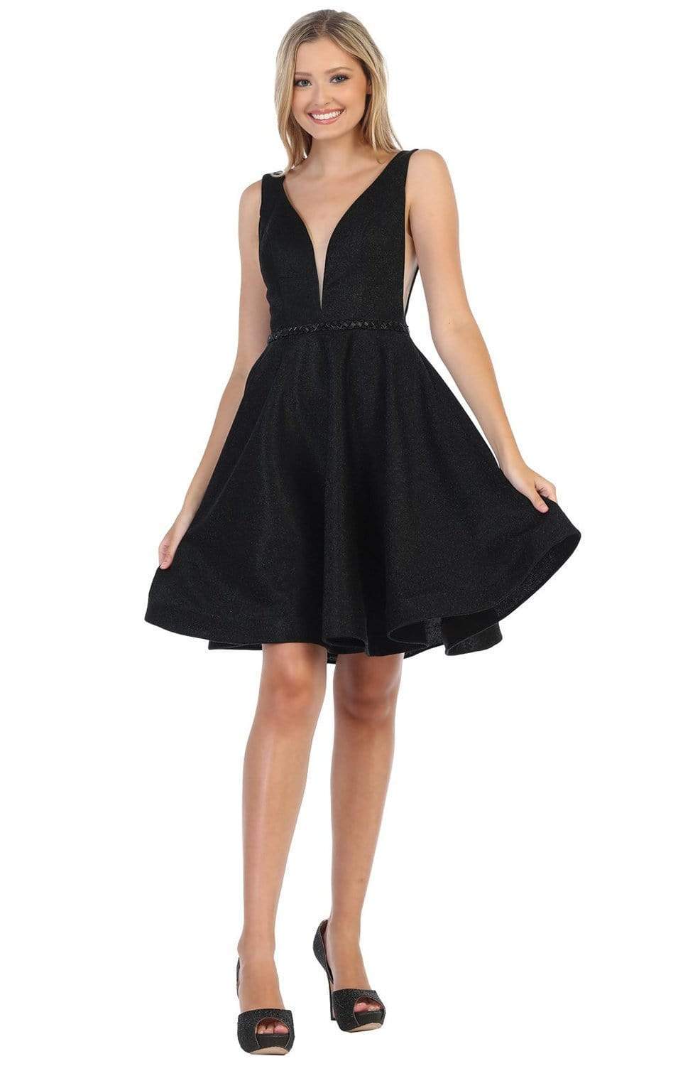 Let yourself be carried away by a tide of unparalleled elegance in this May Queen MQ1696 masterpiece. This dress has been sculpted with an iridescent glitter knit fabric, and it has a molded V-neckline with a sheer insert that flatters the figure. A tonal circlet is applied to texturize the waist, and it is highlighted with an open V at the back. The sides have an angular plunge at the sides. The A-line skirt has a lovely ruffle effect that begins just above the knees. Give yourself a little something nice to enjoy on that special occasion with this opulent MQ1696 masterpiece from May Queen. Models are wearing the Black, Champagne and Royal colors.
