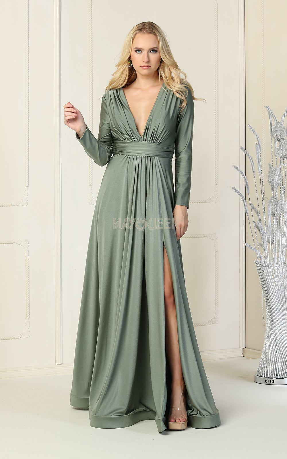 Make a striking entrance in the May Queen MQ1835, a sophisticated long-sleeve gown designed to captivate. Featuring elegant ruching across the bodice and a refined plunging V-neckline, this dress combines structured elegance with fluid movement. The shirred waistband flows into a gracefully proportioned A-line skirt, complete with a subtle slit and dramatic train. Perfect for bridal parties, proms, formal galas, and milestone celebrations, this May Queen creation delivers timeless glamour and unforgettable presence. Dress is pictured in  Black, Blush, Dusty Blue, Eggplant, Huntergreen, Ivory, Lilac, Mustard, Olive, Red, and Royal colors.