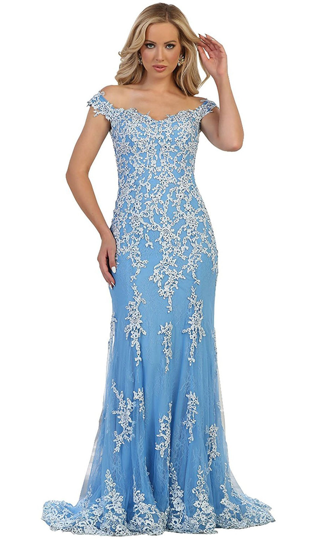 Display your feminine beauty in this impressive evening gown by May Queen - RQ7593. The formal dress is adorned with beaded applique. The enchanting off-the-shoulder bodice features a notched neckline and V-shaped back. Sheer flutters flute along the lower skirt to a flourish of flutters at full-length. Tonal lining extends to the feet. You are sure to catch the attention of the crowd in this May Queen creation.